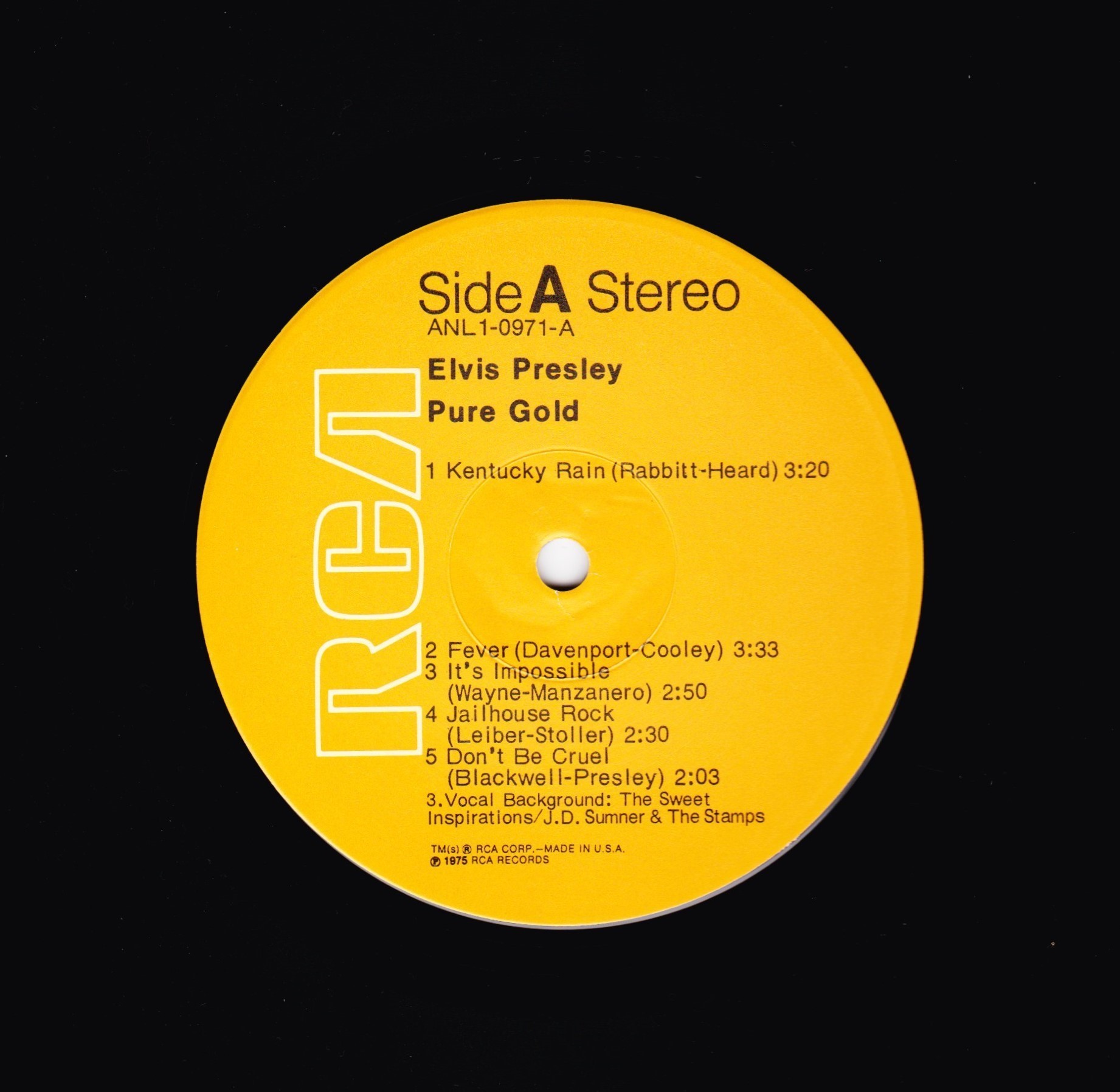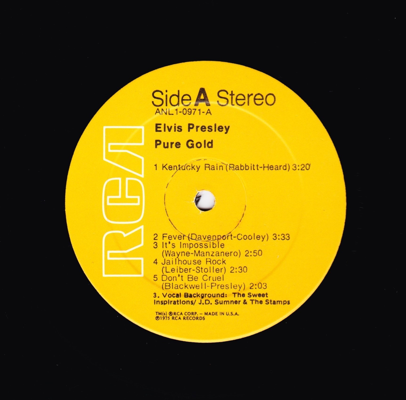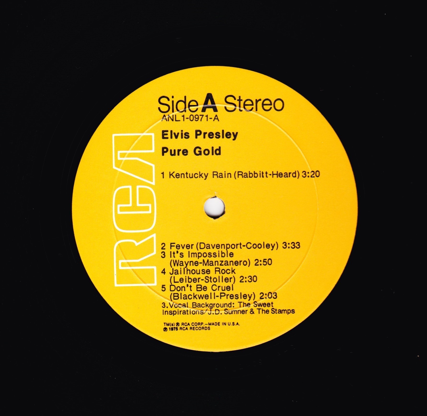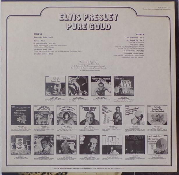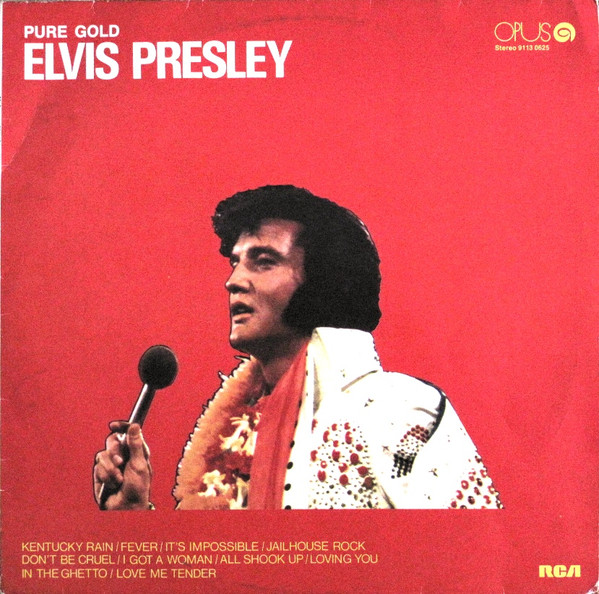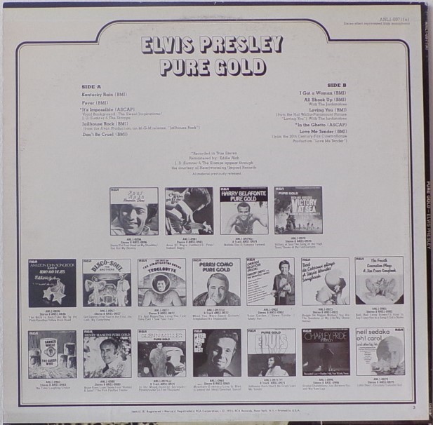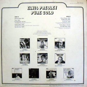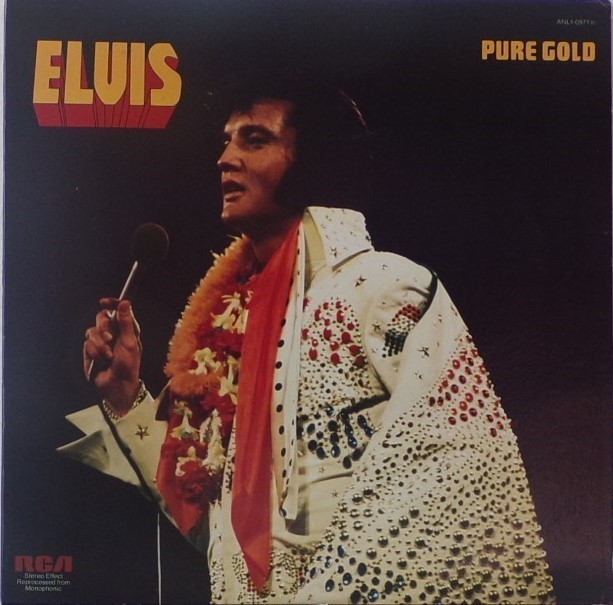 GOLD (LP) Brief History : Pure Gold is a 1975 compilation album by Elvis Presley released as part of RCA's budget "Pure Gold" series of albums. Though at this point in his career Presley was focused more on the country music market, where he had a string of chart-topping records in recent years, this compilation focuses more on earlier material than recent hits. "Kentucky Rain", "Fever", "It's Impossible", and "In The Ghetto" are true stereo mixes. All other tracks are in "electronically reprocessed" stereo. When this album was eventually issued on CD in the early 1990s, the 6 songs from the 50's were restored to original monaural sound. It was certified Gold on 9/12/1977, Platinum on 3/20/1988 and 2x Platinum on 3/27/1992 by the RIAA. The front cover photo features Elvis from his Aloha from Hawaii concert in 1973. Front Cover : Photo of Elvis. Title top right. Catalogue