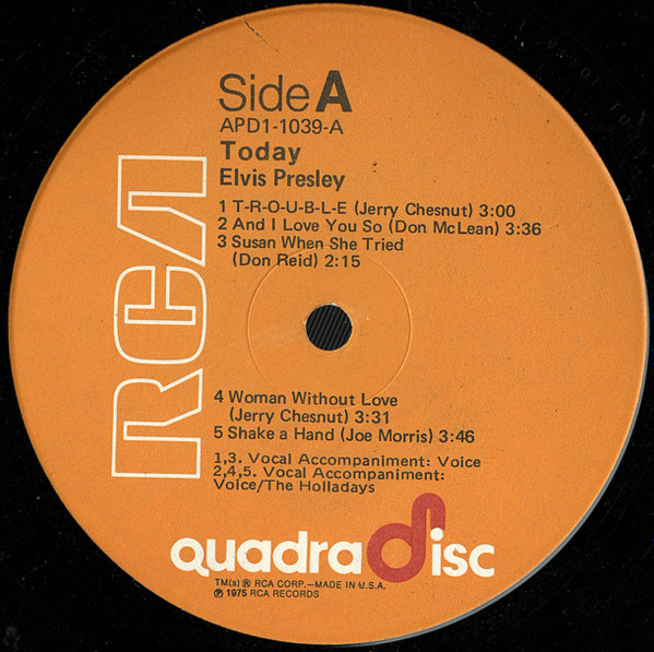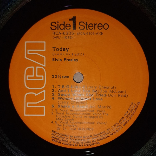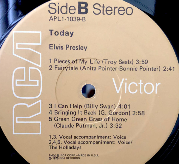 TODAY (LP) (US) RCA APL1 1039 Label: RCA Victor – APL1-1039 Format: Vinyl, LP, Album Country: US Released: 1975 Side 1 T-R-O-U-B-L-E And I Love You So ** Susan When She Tried ** Woman Without Love *** Shake A Hand *** Side 2 Pieces Of My Life **** Fairytale * I Can Help ** Bringin' It Back *** Green, Green Grass Of Home ** *
