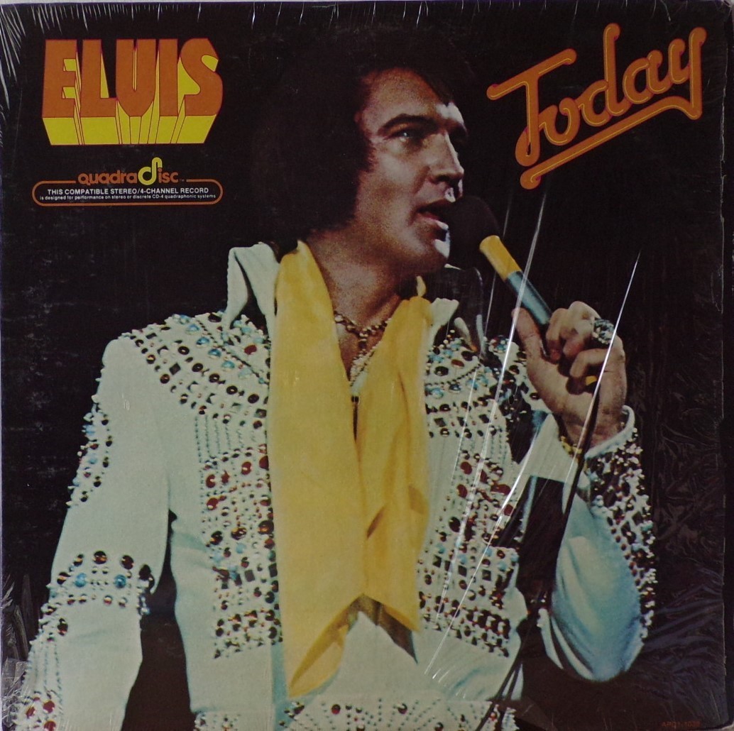 B2, B4, B5), Voice (11) Brief History : CD-4 (Compatible Discrete 4) / Quadradisc Compatible Discrete 4 (CD-4) or Quadradisc (not to be confused with compact disc) was introduced in May 1972 as a discrete quadraphonic system created by JVC and RCA. Record companies who adopted this format include Arista, Atlantic, Capricorn, Elektra, Fantasy, JVC, Nonesuch, A & M, Reprise and Warner. This was the only fully discrete quadraphonic phonograph record system to gain major industry acceptance. In the CD-4 system, the quadraphonic audio was divided into left and right channels, which were recorded orthogonally in the vertical plane of the disc groove, which is the case with normal stereo. The audio frequencies (20 Hz to 15 kHz), often referred to as the sum channel, would contain the sum of the left front plus left back signals in the left channel and the sum of the right front plus the right back signals in the right channel. In other words, when observing the audio frequencies only, the record appeared to have an ordinary stereo recording. Along with this audio, a separate 30 kHz carrier was recorded on each groove wall. The carrier on each side carried the difference signal for that side. This was the information that enabled a combined signal to be resolved into two separate signals. For the left carrier it would be left front minus left back, and for the right carrier it would be the right front minus the right back. These audio signals were modulated onto the carriers using a special FM-PM-SSBFM (frequency modulation-phase modulation-single sideband frequency modulation) technique. This created an extended carrier frequency range from 18 kHz to 45 kHz for the left and right channels. The algebraic addition and subtraction of the sum and difference signals would then yield compatible and discrete quadraphonic playback. CD-4 was responsible for major improvements in phonograph technology including better compliance, lower distortion levels, pick-up cartridges with a significantly higher frequency range, and new record compounds such as Q-540, which were highly anti-static. A typical CD-4 system would have a turntable with a CD-4 cartridge, a CD-4 demodulator, a discrete four-channel amplifier, and (ideally) four full-range loudspeakers. Some manufactures built the CD-4 demodulator into complete four-channel receivers. Simply put, CD-4 consists of four recorded signals (LF, LB, RB, RF) and the following coding matrix, similar to FM broadcast stereo multiplexing. The CD-4 encoding/decoding matrix: (LF+LB)+(LF-LB)=2LF or left front (LF+LB)-(LF-LB)=2LB or left back (RF+RB)+(RF-RB)=2RF or right front (RF+RB)-(RF-RB)=2RB or right back There was also a similar FM radio system called Quadracast. But CD-4 (and quadraphonic audio in general) failed due to late FCC approval of FM quadraphonic broadcasting, the improvements CD-4 engendered spilled over into, and substantially improved, the production of conventional stereo LP records. The CD-4 record track is broader than a conventional stereo track, so maximum the playing time is lower than a conventional stereo record. Quadradiscs/CD-4 records were seldom called quadraphonic. When a record was called quadraphonic it was almost always an SQ-encoded or an other matrixed record. But when a record was called quadradisc it was always a CD-4 record. Front Cover : Photo of Elvis. Title top right. Quadradisc