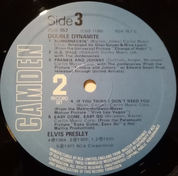 DYNAMITE (LP) Brief History : Double Dynamite is a compilation album by Elvis Presley. The album was released in December, 1975, and compiles various tracks that had previously been released on 9 budget-priced albums on the RCA Camden label. It was certified Gold and Platinum on 1/6/2004 by the RIAA. Front Cover : Photo of Elvis. Title top right. Catalogue