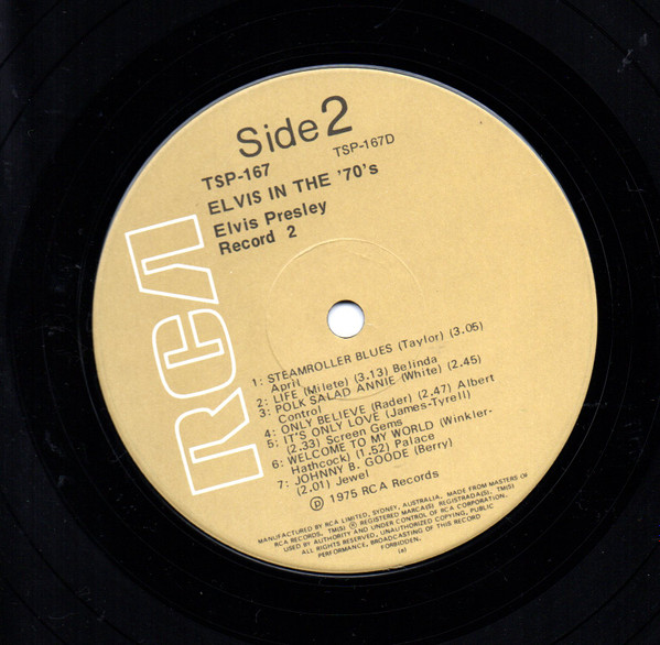 | Elvis In The 70's Label: RCA Victor – TSP-167 Australian compiled and manufactured double album. "Made in Australia" on spine, A1075N release date code on lower RH rear cover corner Matrix / Runout ( record 1, side 1 label ): TSP-167A |