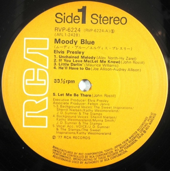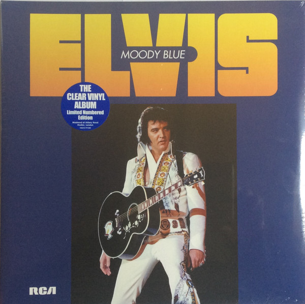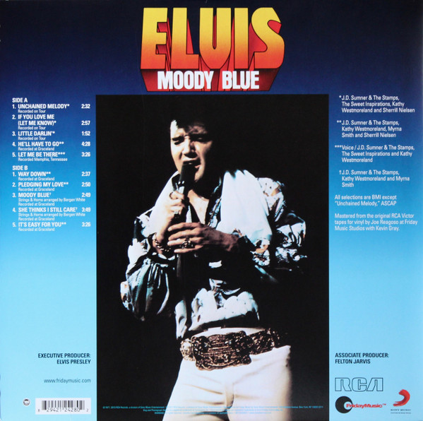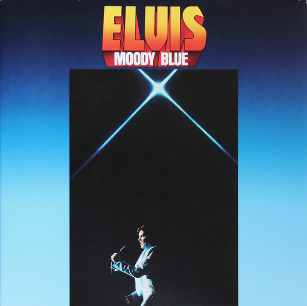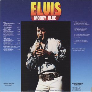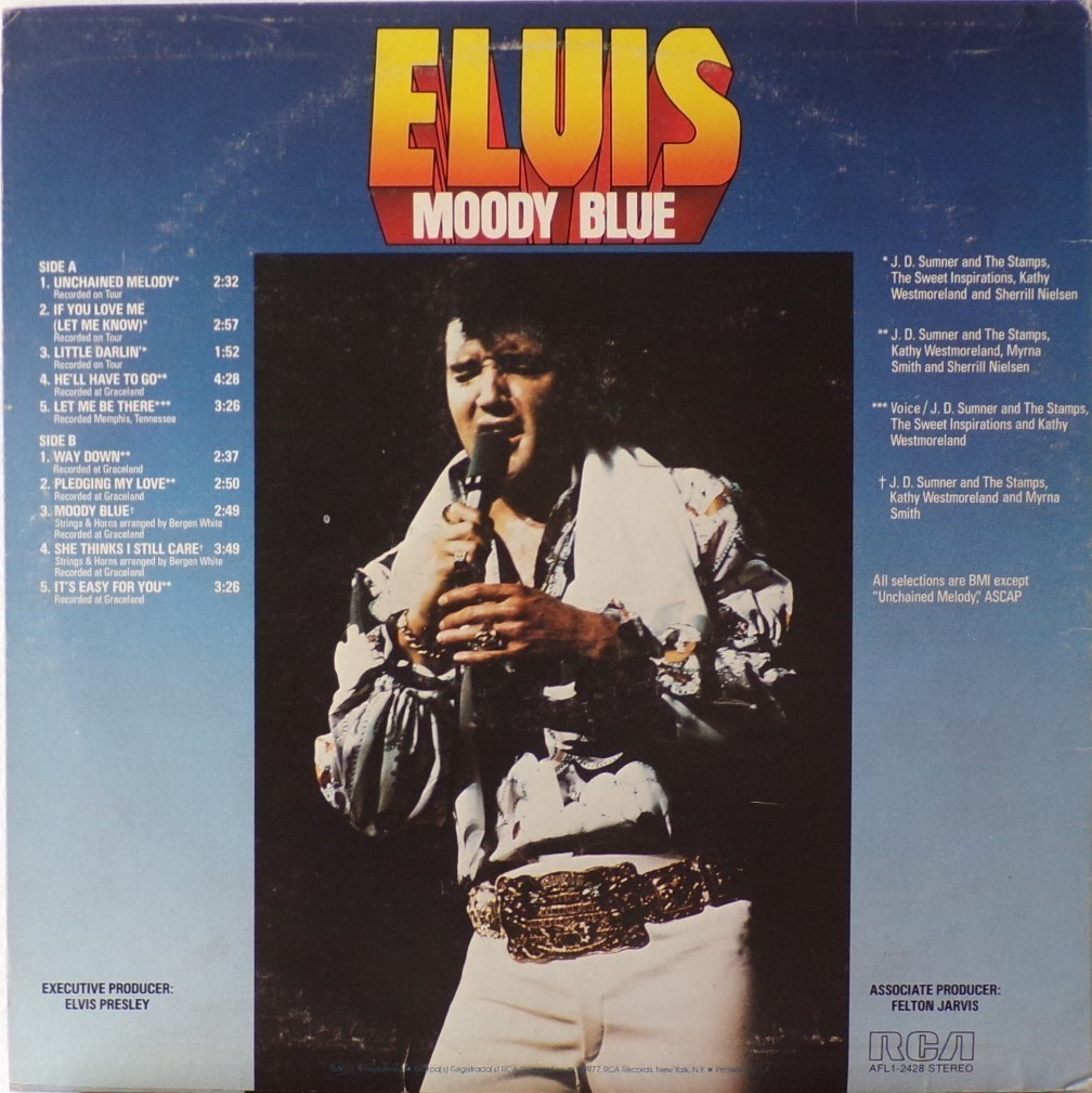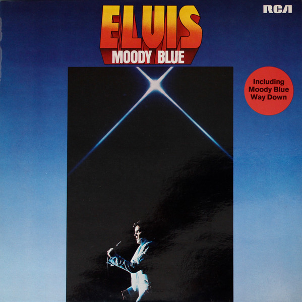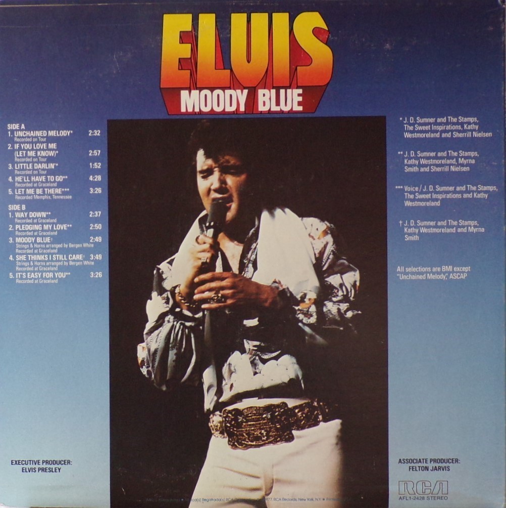 BLUE (LP) (US) RCA AFL1 2428 Released: July 1977 Side 1 Unchained Melody *** If You Love Me (Let Me Know) **** Little Darlin' *** He'll Have To Go ** Let Me Be There (From Live On Stage In Memphis 20/3/74) Side 2 Way Down Pledging My Love Moody Blue She Thinks I Still Care It's Easy For You * * Recorded: Graceland, Memphis, October 29, 1976 Brief History : As described in Elvis: The Illustrated Record, RCA was not able to obtain sufficient new studio material for a complete album, with all but six songs of Presley's studio recordings of 1976 having already been used in the previous album, From Elvis Presley Boulevard, Memphis, Tennessee. The company chose to augment the remaining available works with three live songs recorded in Ann Arbor, Michigan, on April 24 and 26, 1977, including his version of "Unchained Melody" which was the album's third single, released posthumously. RCA and the producer Felton Jarvis had booked a recording studio in Nashville, Tennessee, for January 1977, to record some new tracks for this album. Presley had chosen a few songs to record with the help of Jarvis, most of them were rather country and uptempo. Unfortunately, Presley never showed up at that session, claiming that he was sick and thus staying home (an excuse that Presley used rather frequently during the 1960s to avoid recording poor soundtracks for his motion pictures). Jarvis and RCA had nothing left to do but to fill the album with the live tracks mentioned above. Also included is a live performance of "Let Me Be There" which had already been released three years earlier on his album Elvis: As Recorded Live on Stage in Memphis. The song Moody Blue was released as a single in December 1976 and it reached number one on the Billboard Country Singles Chart, and #31 on the pop chart. "Way Down" was released as the album's next single during the early summer of 1977. It did not go very far up the chart, but it soared to #18 after Presley's death in August (jumping to number one in the U.K.) It was a bigger hit on the country charts, and it had risen to number one in the same week of the death of Presley. This album reached number three on the Billboard album charts after his death, although it had already entered the top 40 before he died. This was the last album by Presley to reach the TOP 40. Moody Blue was also a number one album on the Country Albums chart. Moody Blue was published on July 19, 1977, and it peaked on the album chart in August 1977. RCA pressed the album on blue vinyl, to match the title track. Since colored vinyl pressings were relatively rare, and they almost never occurred in a wide release, this has led to collectors mistakenly assuming that blue-vinyl albums of Moody Blue are collectors' items, when in fact the true collectables are pressings from immediately before Presley's death on standard black vinyl. (Immediately following his death, the production of Moody Blue was shifted back to blue vinyl. However, in some later years the album was produced using standard black vinyl). Following Presley's death, "Unchained Melody" was also released as a single, and it peaked at #6 on the country music charts. The original CD issue had the standard songs of the original. The CD reissue of the year 2000 revised the cover art including a different concert photo of Elvis, omitted the track "Let Me Be There", due to its presence on Elvis: As Recorded Live on Stage in Memphis, and it added the complete album From Elvis Presley Boulevard, Memphis, Tennessee as tracks 10-19 - in effect compiling the Graceland sessions rather than reissuing the album. It was certified Gold and Platinum on 9/12/1977 and 2x Platinum on 3/27/1992 by the RIAA. Front Cover : Photo of Elvis. Title on top. Catalogue number top