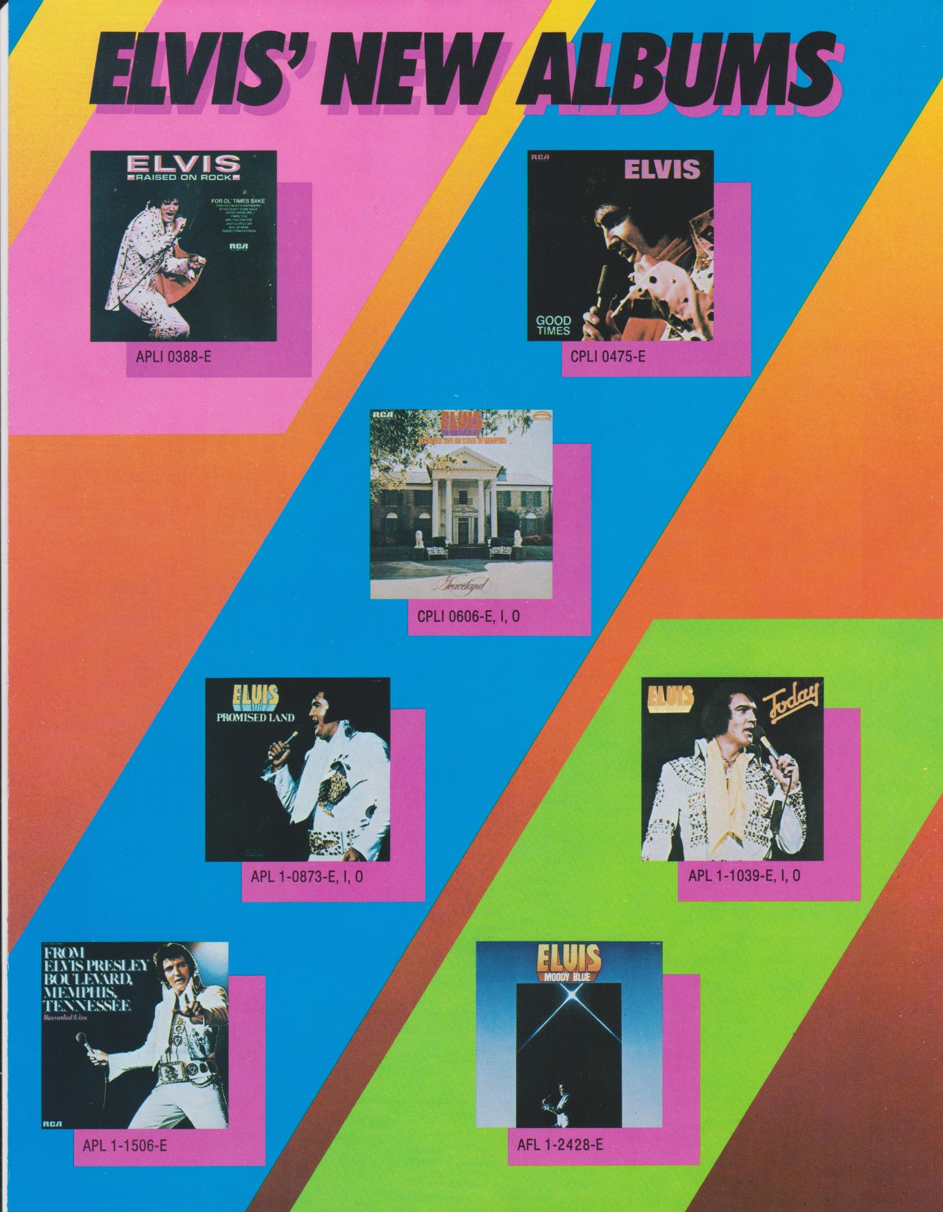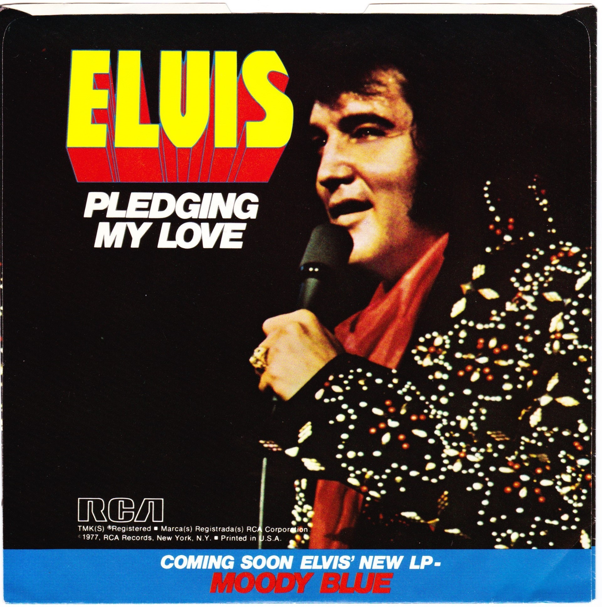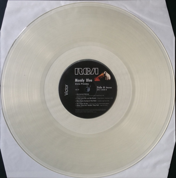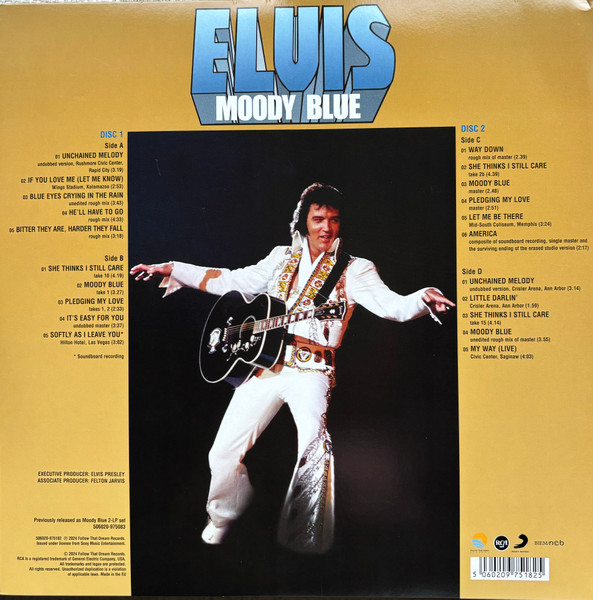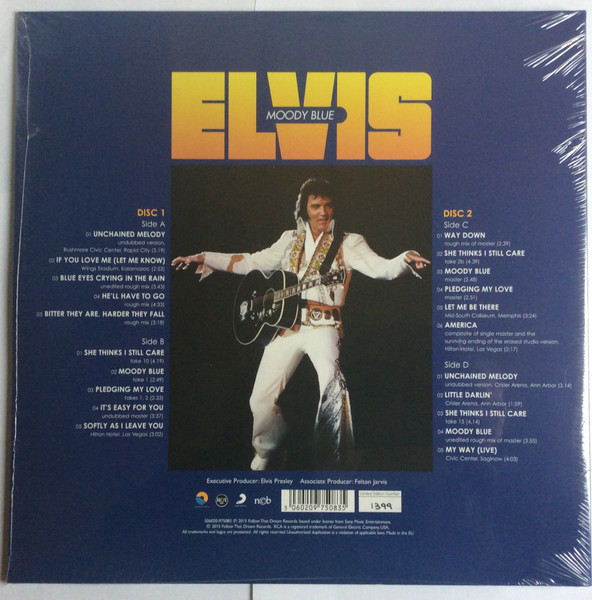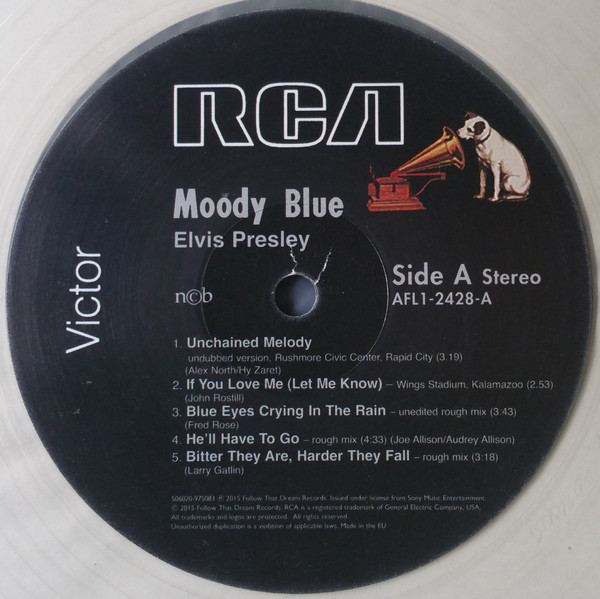 BLUE (LP) (US) RCA AFL1 2428 Released: July 1977 Side 1 Unchained Melody *** If You Love Me (Let Me Know) **** Little Darlin' *** He'll Have To Go ** Let Me Be There (From Live On Stage In Memphis 20/3/74) Side 2 Way Down Pledging My Love Moody Blue She Thinks I Still Care It's Easy For You * * Recorded: Graceland, Memphis, October 29, 1976 Brief History : As described in Elvis: The Illustrated Record, RCA was not able to obtain sufficient new studio material for a complete album, with all but six songs of Presley's studio recordings of 1976 having already been used in the previous album, From Elvis Presley Boulevard, Memphis, Tennessee. The company chose to augment the remaining available works with three live songs recorded in Ann Arbor, Michigan, on April 24 and 26, 1977, including his version of "Unchained Melody" which was the album's third single, released posthumously. RCA and the producer Felton Jarvis had booked a recording studio in Nashville, Tennessee, for January 1977, to record some new tracks for this album. Presley had chosen a few songs to record with the help of Jarvis, most of them were rather country and uptempo. Unfortunately, Presley never showed up at that session, claiming that he was sick and thus staying home (an excuse that Presley used rather frequently during the 1960s to avoid recording poor soundtracks for his motion pictures). Jarvis and RCA had nothing left to do but to fill the album with the live tracks mentioned above. Also included is a live performance of "Let Me Be There" which had already been released three years earlier on his album Elvis: As Recorded Live on Stage in Memphis. The song Moody Blue was released as a single in December 1976 and it reached number one on the Billboard Country Singles Chart, and #31 on the pop chart. "Way Down" was released as the album's next single during the early summer of 1977. It did not go very far up the chart, but it soared to #18 after Presley's death in August (jumping to number one in the U.K.) It was a bigger hit on the country charts, and it had risen to number one in the same week of the death of Presley. This album reached number three on the Billboard album charts after his death, although it had already entered the top 40 before he died. This was the last album by Presley to reach the TOP 40. Moody Blue was also a number one album on the Country Albums chart. Moody Blue was published on July 19, 1977, and it peaked on the album chart in August 1977. RCA pressed the album on blue vinyl, to match the title track. Since colored vinyl pressings were relatively rare, and they almost never occurred in a wide release, this has led to collectors mistakenly assuming that blue-vinyl albums of Moody Blue are collectors' items, when in fact the true collectables are pressings from immediately before Presley's death on standard black vinyl. (Immediately following his death, the production of Moody Blue was shifted back to blue vinyl. However, in some later years the album was produced using standard black vinyl). Following Presley's death, "Unchained Melody" was also released as a single, and it peaked at #6 on the country music charts. The original CD issue had the standard songs of the original. The CD reissue of the year 2000 revised the cover art including a different concert photo of Elvis, omitted the track "Let Me Be There", due to its presence on Elvis: As Recorded Live on Stage in Memphis, and it added the complete album From Elvis Presley Boulevard, Memphis, Tennessee as tracks 10-19 - in effect compiling the Graceland sessions rather than reissuing the album. It was certified Gold and Platinum on 9/12/1977 and 2x Platinum on 3/27/1992 by the RIAA. Front Cover : Photo of Elvis. Title on top. Catalogue number top
