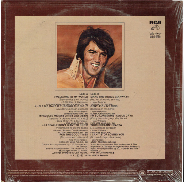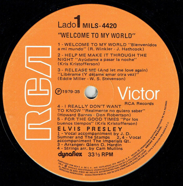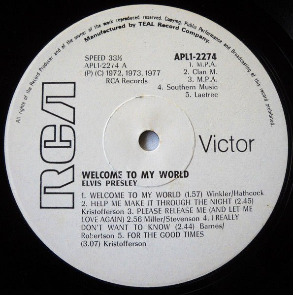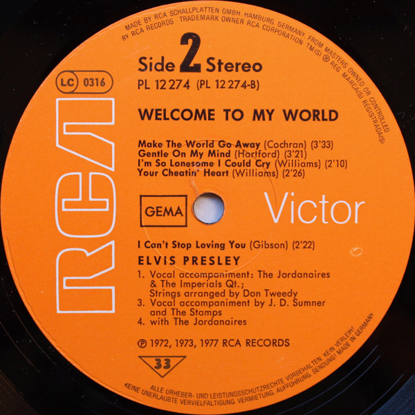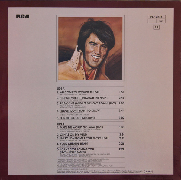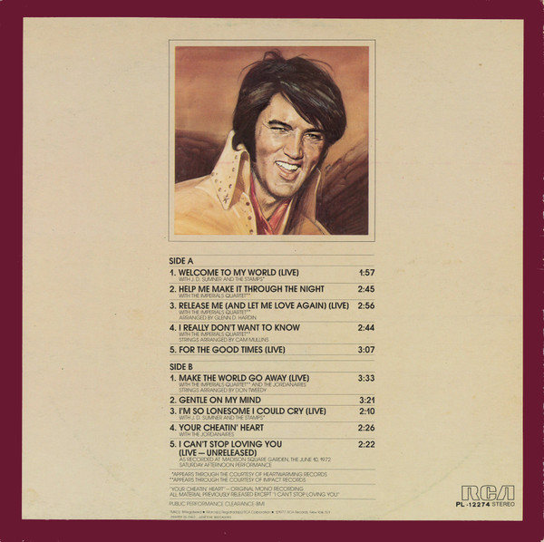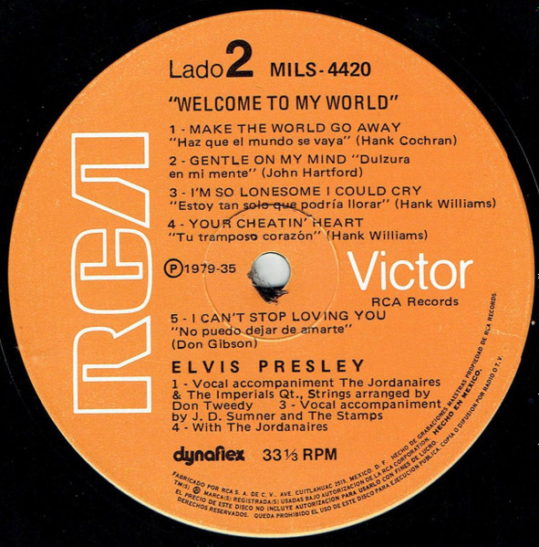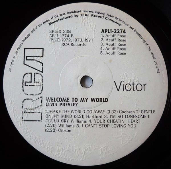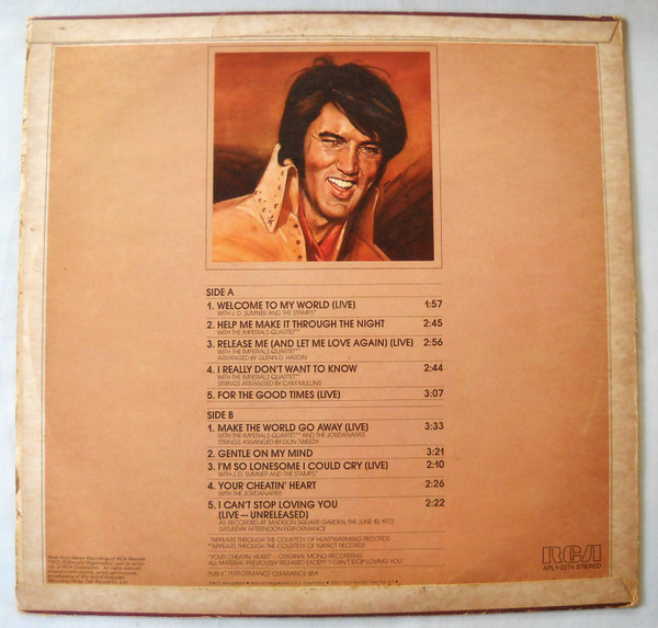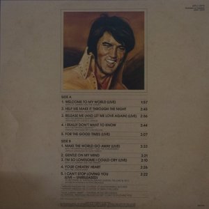 TO MY WORLD (LP) Brief History : Welcome to My World was the title of a compilation album by Elvis Presley that was released by RCA Records in early 1977, just months before his death. According to Elvis: The Illustrated Record by Roy Carr and Mick Farren, all but one track on this album had been previously released (one track, "Your Cheatin' Heart", dated back 20 years). The only previously unissued recording is "I Can't Stop Loving You" which was taken from a 1972 performance in New York City that as of 1977 had not yet been released. (It later appeared on CD as An Afternoon in the Garden.) It was certified gold on September 30, 1977 and platinum on January 14, 1983 by the RIAA. Front Cover : Photo of Elvis. Title on top. Catalogue number top