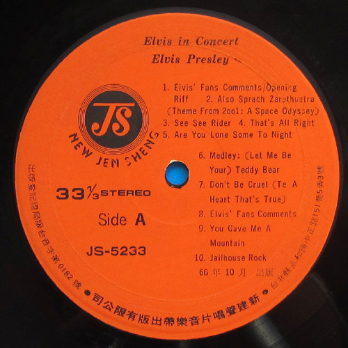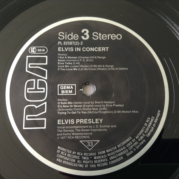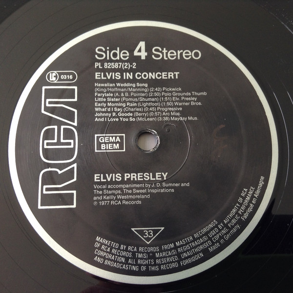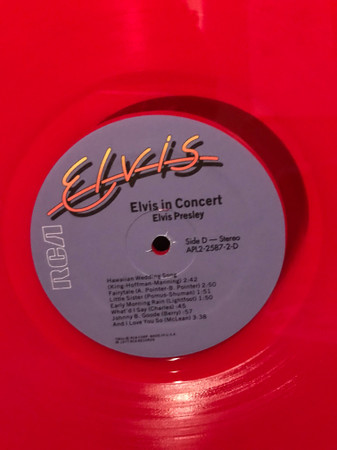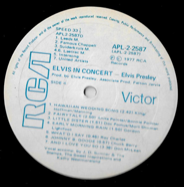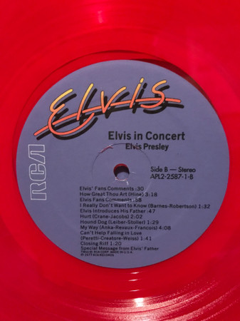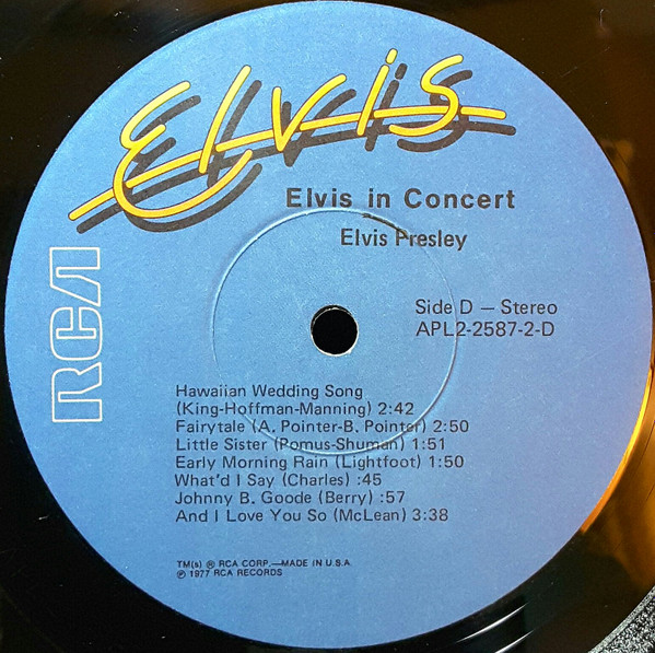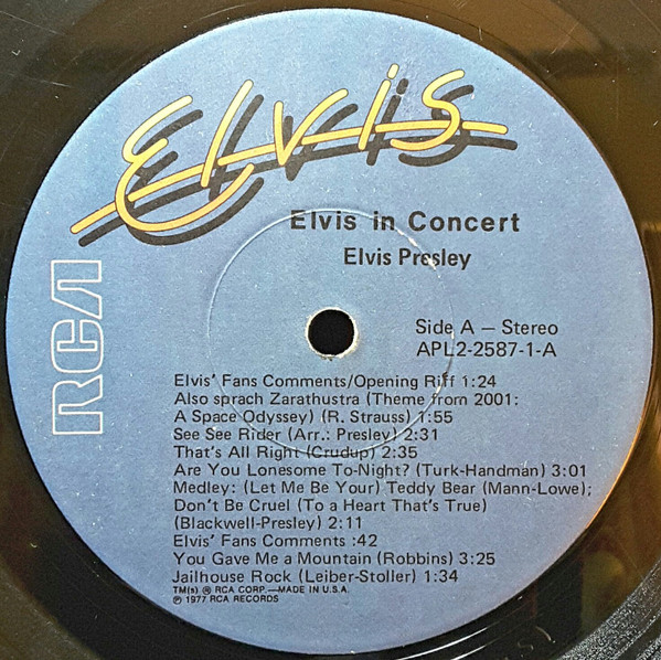IN CONCERT (LP) (US) RCA APL2 2587 Released: October 3, 1977 Side 1 Elvis Fans Comments / Opening Riff / Also Sprach Zarathustra ** See See Rider ** That's All Right ** Are You Lonesome Tonight ** Teddy Bear / Don't Be Cruel * Elvis Fans Comments You Gave Me A Mountain ** Jailhouse Rock ** Side 2 Elvis Fans Comments How Great Thou Art * Elvis Fans Comments I Really Don't Want To Know ** Elvis Introduces His Father ** Hurt ** Hound Dog ** My Way ** Can't Help Falling In Love * Closing Riff * Special Message From Elvis' Father Side 3 I Got A Woman / Amen ** Elvis Talks ** Love Me ** If You Love Me (Let Me Know) ** It's Now Or Never ** Trying To Get To You ** Side 4 Hawaiian Wedding Song ** Fairytale * Little Sister * Early Mornin' Rain ** What'd I Say ** Johnny B Goode ** And I Love You So * * Recorded: