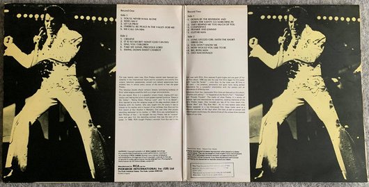 Civic Auditorium Arena, Omaha, Nebraska, June 19, 1977 Brief History : Elvis in Concert is the title of the soundtrack album released in conjunction with the television special of the same name which featured some of the final performances of Elvis Presley. Videotaped and recorded in June 1977, both the special and album were broadcast and released on October 3, 1977, (the single "My Way"/"America the Beautiful" was also released that day too) two months after Presley's death. The album peaked to #5 on the Billboard chart in the fall of 1977. It was certified Gold and Platinum on 10/14/1977 and 3x Platinum on 8/1/2002 by the RIAA. The show was recorded over two days at concerts in Omaha on June 19 and Rapid City, South Dakota on the 21st. Longtime RCA/Elvis producer Felton Jarvis produced the recordings, which were done to 4-track multitrack. According to Elvis: The Illustrated Record by Roy Carr and Mick Farren, the shows were taped with the intent of producing a television special, but Presley's deteriorating physical condition put the project on hold. After his death, they write, it was decided to go ahead with the special as a tribute. Although both the June 19th and 21st concerts are the last official live professional one's ever recorded of Presley alive, Vernon Presley, Elvis' father, recorded a message that was broadcast at the end of the special and included on the soundtrack album, in which he erroneously states that the performance featured was his son's last appearance; in fact Elvis made five more concert appearances after the filming of the special. Elvis' last concert was in fact on Sunday, June 26, 1977 at the Market Square Arena in Indianapolis, Indiana. No professional recording of this last performance has ever been issued, but bootlegs of amateur recordings have. During the special, Presley performs a selection of his hits, along with songs not normally associated with him. Although it was a regular part of his repertoire for years, Presley requires a lyric sheet when he performs Paul Anka's "My Way" (noted for its opening lyric, "And now the end is near/And so I face the final curtain"). He also loses his train of thought during "Are You Lonesome Tonight?", although Darrin Memmer's book "Elvis Presley - The 1977 CBS Television Special," published in 2001 by Morris Publishing, makes a strong case that Elvis regularly played around with the words during the spoken portion of the song when performing it on stage, rather than it being a case of poor memory. Indeed a concert recording of Presley similarly joking around during the monologue section of "Are You Lonesome Tonight?" dating from 1969 has been issued by RCA on numerous occasions (dubbed the "Laughing Version", it even made the UK charts after Presley's death), and he also poked fun at the song during his 1968 Comeback Special. The soundtrack album was issued as a 2-LP package, including a second disc of performances that were not included in the TV special. It was also released on 8-track. On May 22, 1992, the special saw its first release on a single-disc CD. Unfortunately the CD barely improved on the somewhat muffled sound quality of the original album. Front Cover : Photo of Elvis Title top. Catalogue number top right. *NOTE* 4 Page Boxcar insert advertising the LP catalogue of Elvis Presley. This was inside this sealed copy. |