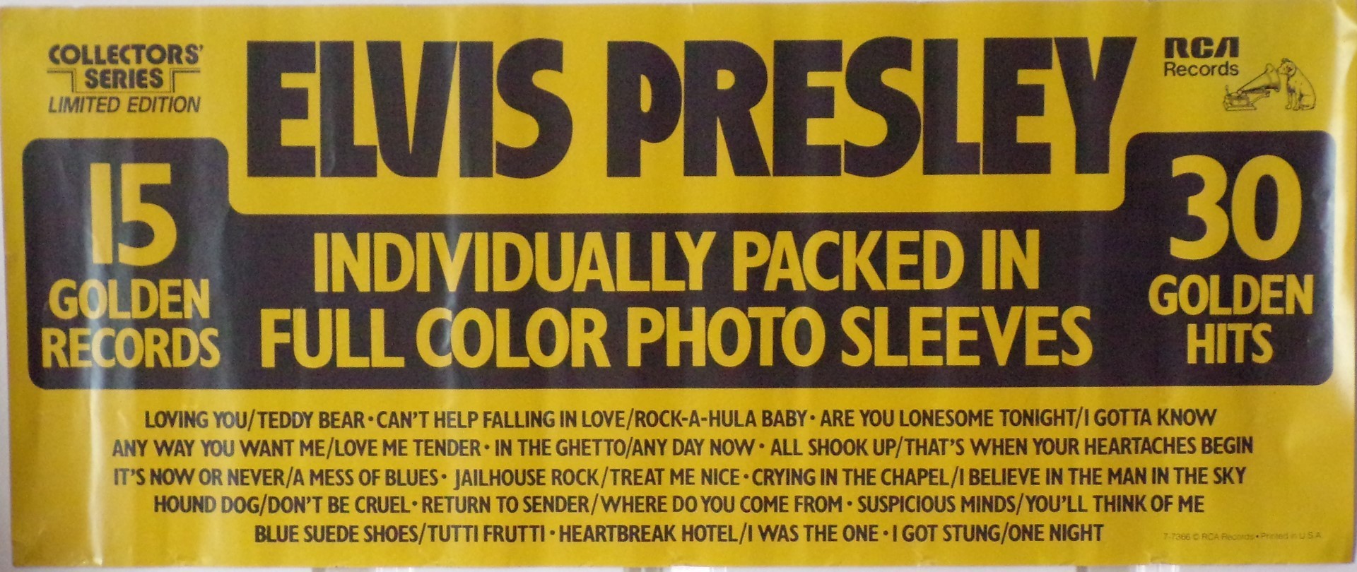 15 Golden Records - 30 Golden Hits Label: RCA – PP-11301 Collectors' Series Limited Edition Box Set Box: Black box, yellowish golden letters. The dimensions is a square 7 1/4" and 1 3/8" wide. Each side features a list of the contents contained inside the box. On the top and bottom flap is PP-11301. Inside each flap is 21-107-15 PT1. A sealed example exists that contains a PROMO-COPY NOT FOR SALE sticker affixed to the box. Box contains 15 individually packaged records each in a full color picture sleeve. Brief History : This was a 15 x 45 set of singles released in a box set. It is a "Collectors' Series" Limited Edition. They were all released with picture sleeves. Each record was pressed on black vinyl with the dog near the top. They were all released previous on the "Gold Standard Series". Of the 15 records in this set, 10 of them were also issued in a 10 record set called RCA PP-11340 20 Golden Hits in Full Color Sleeves. All records in this COLLECTORS’ SERIES LIMITED EDITION are issued in the GOLD STANDARD SERIES. Corresponding reference numbers for each title are listed above. These titles are listed individually as some may have access to only one title of this set. RCA PB-11099 released on Gold Standard label as RCA 447-0608) |