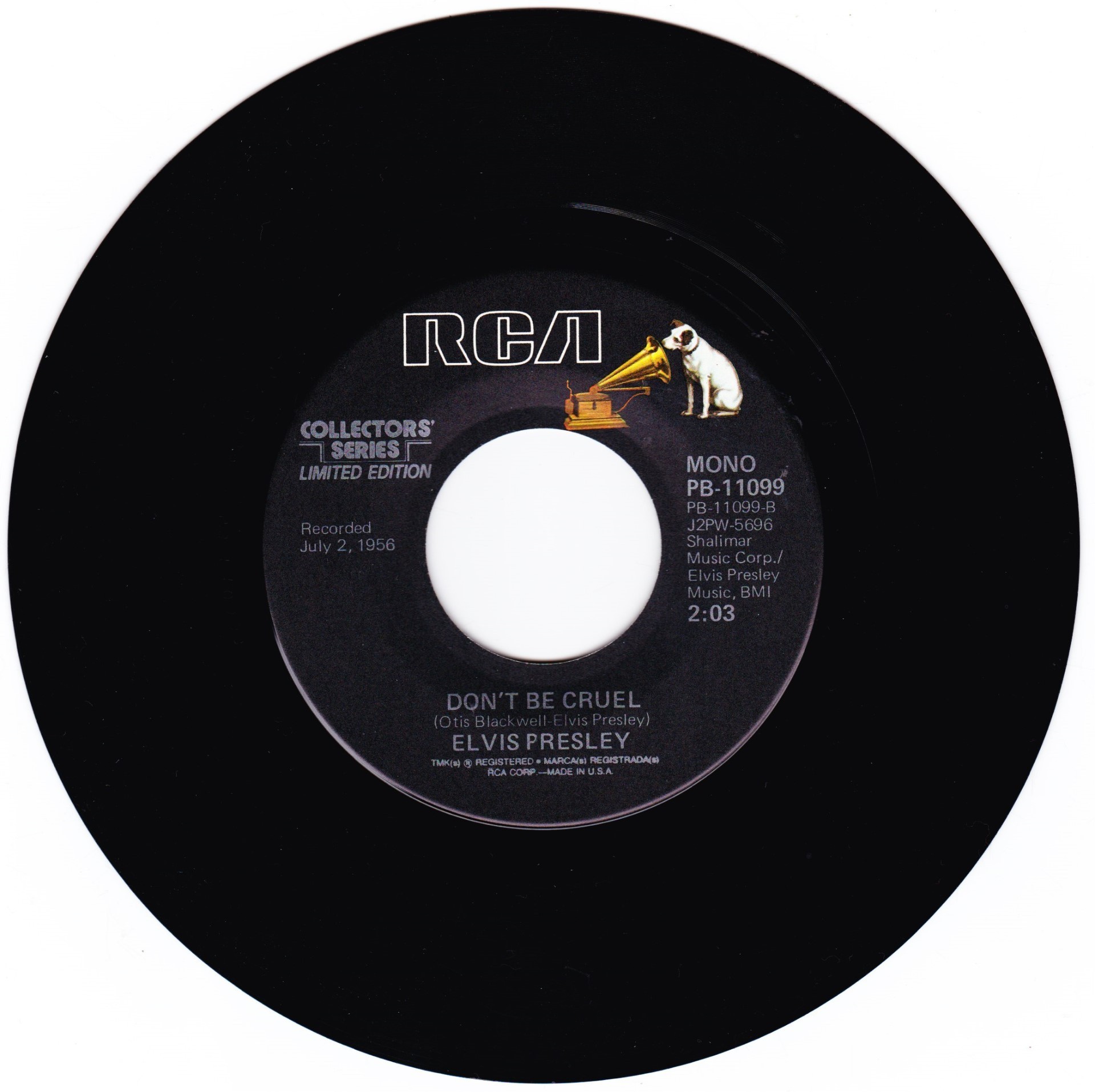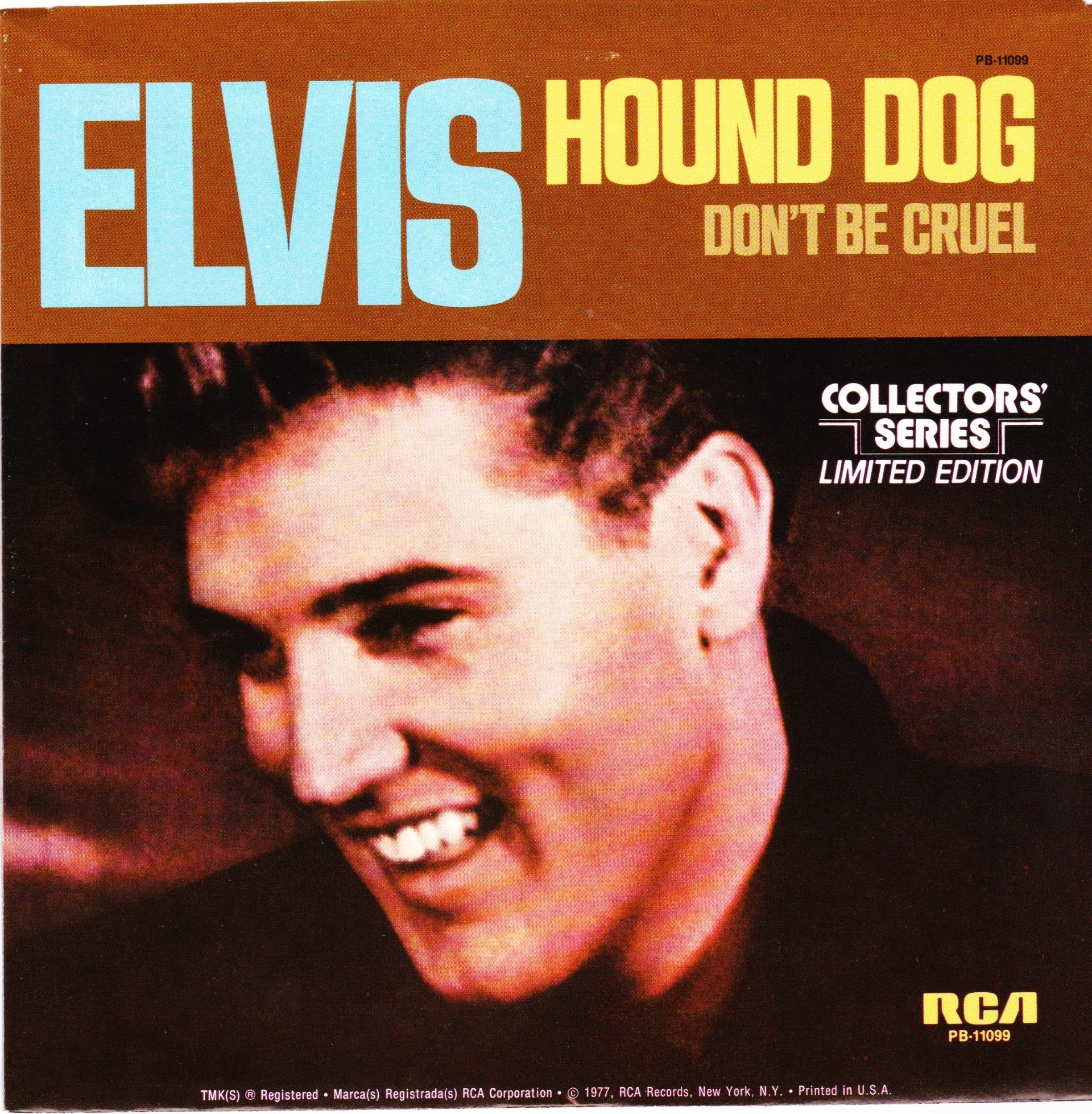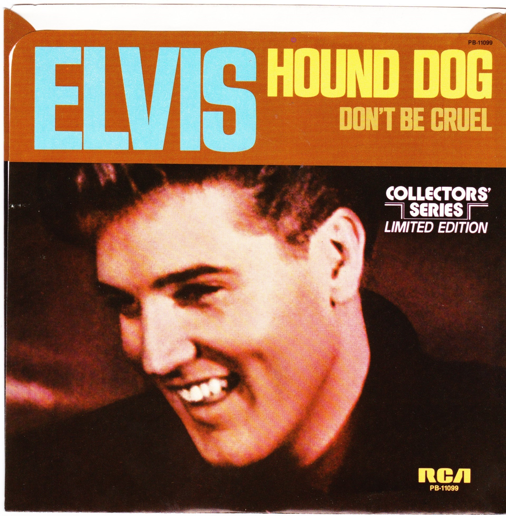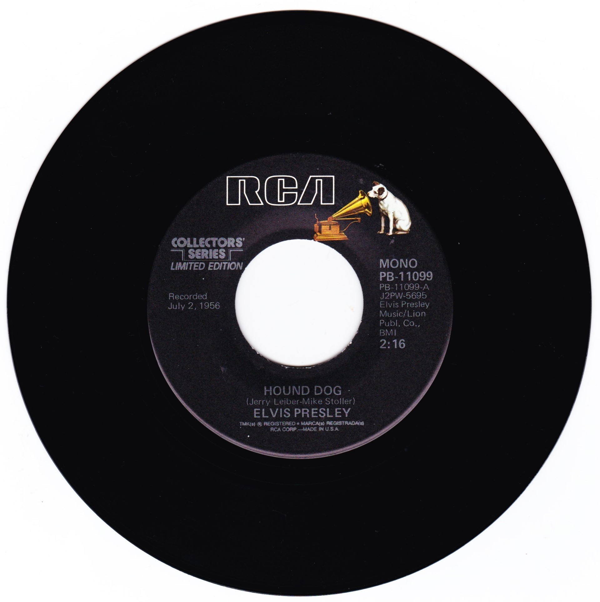 | Details : Reissue with new catalogue number Side A : Hound Dog Side B : Don't Be Cruel Front Cover : Picture Sleeve Rear Cover : Picture Sleeve Label : Black Pressing Plant : Indianapolis Matrix Number Side 1 : J2 - PW 5695 - 10S A1 PB - 11099 - A (Machine Stamped) Matrix Number Side 2 : J2 - PW 5696 - 9S A2 PB - 11099 - B (Machine Stamped) *NOTE* PB - 11099 |