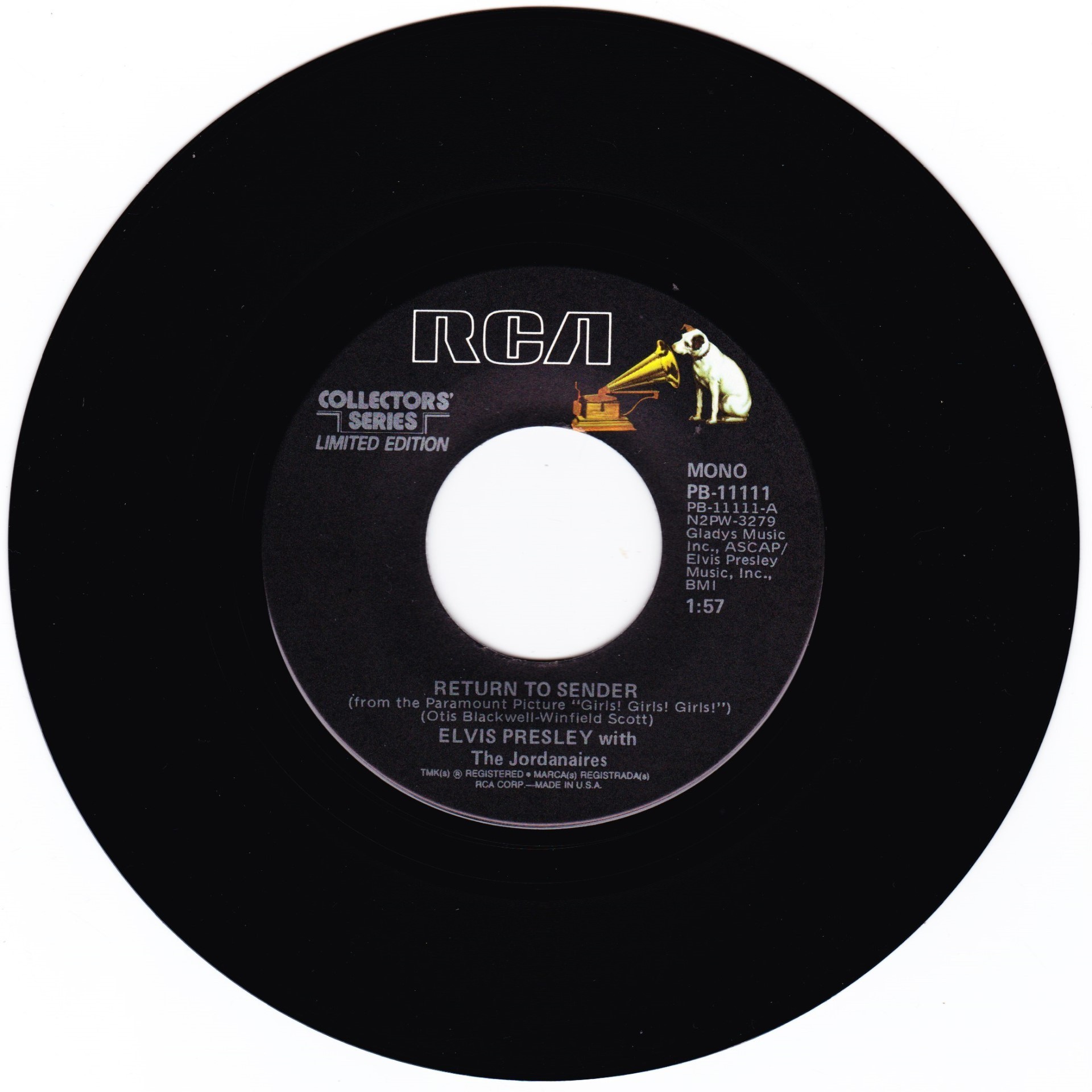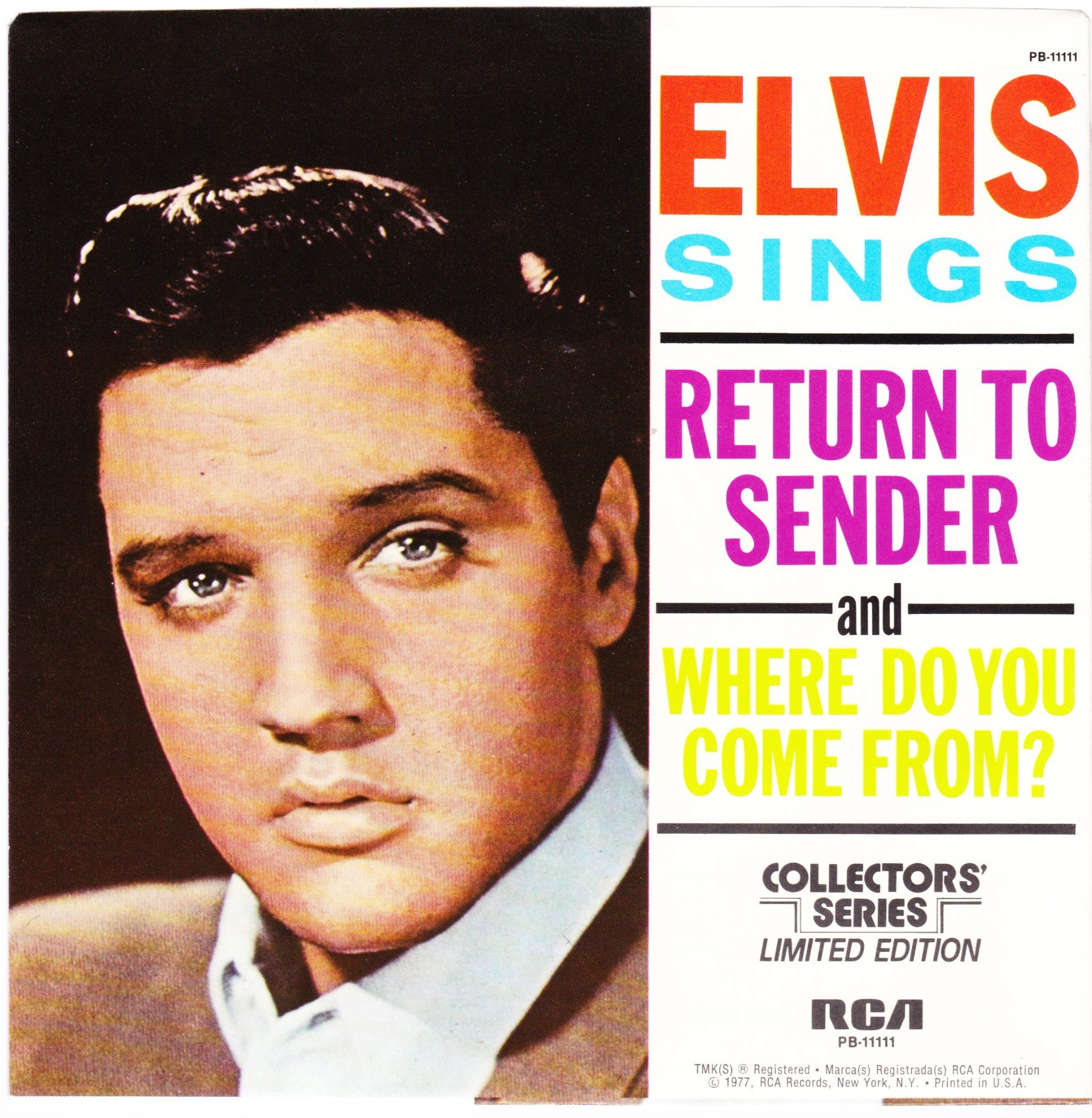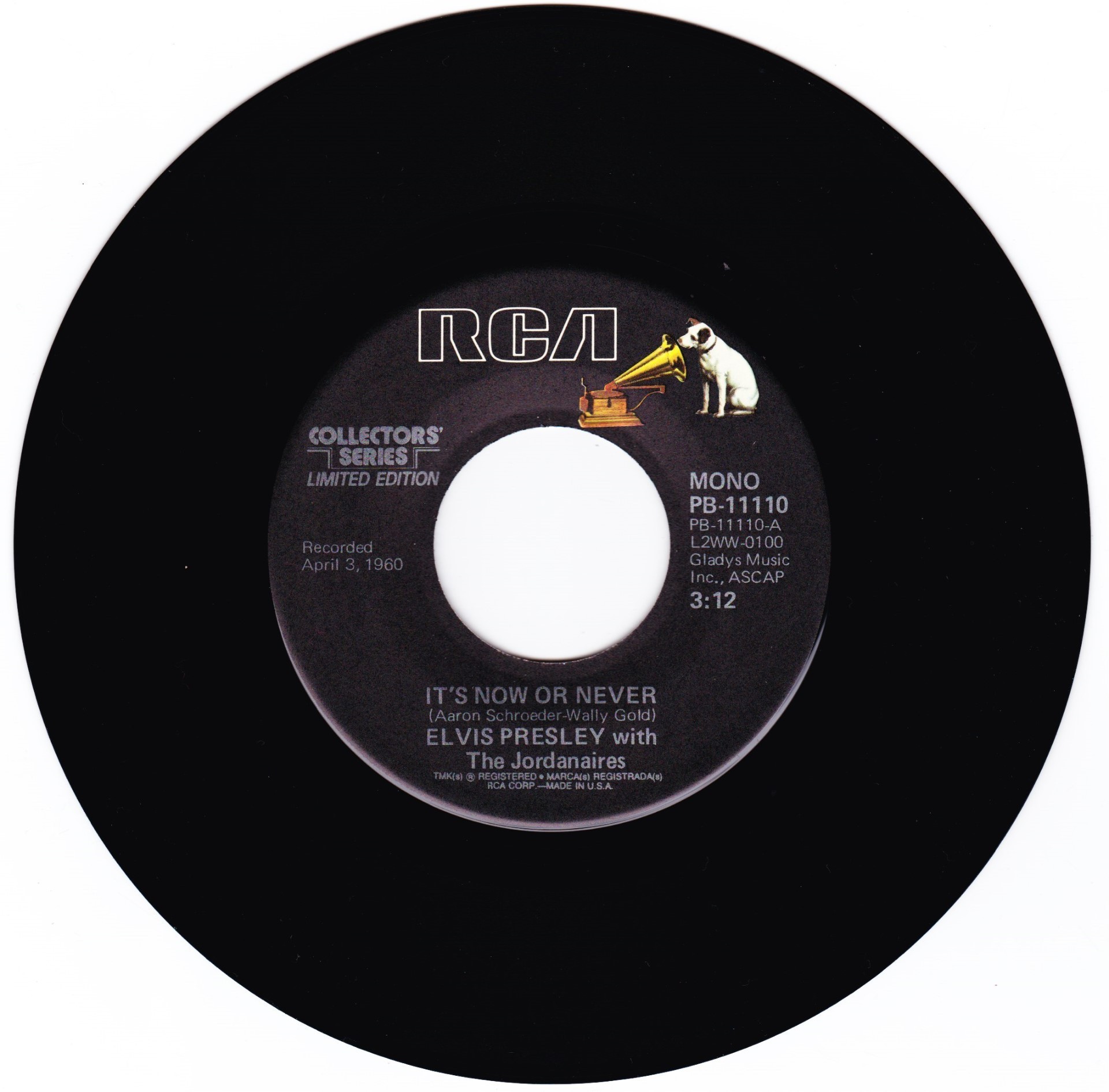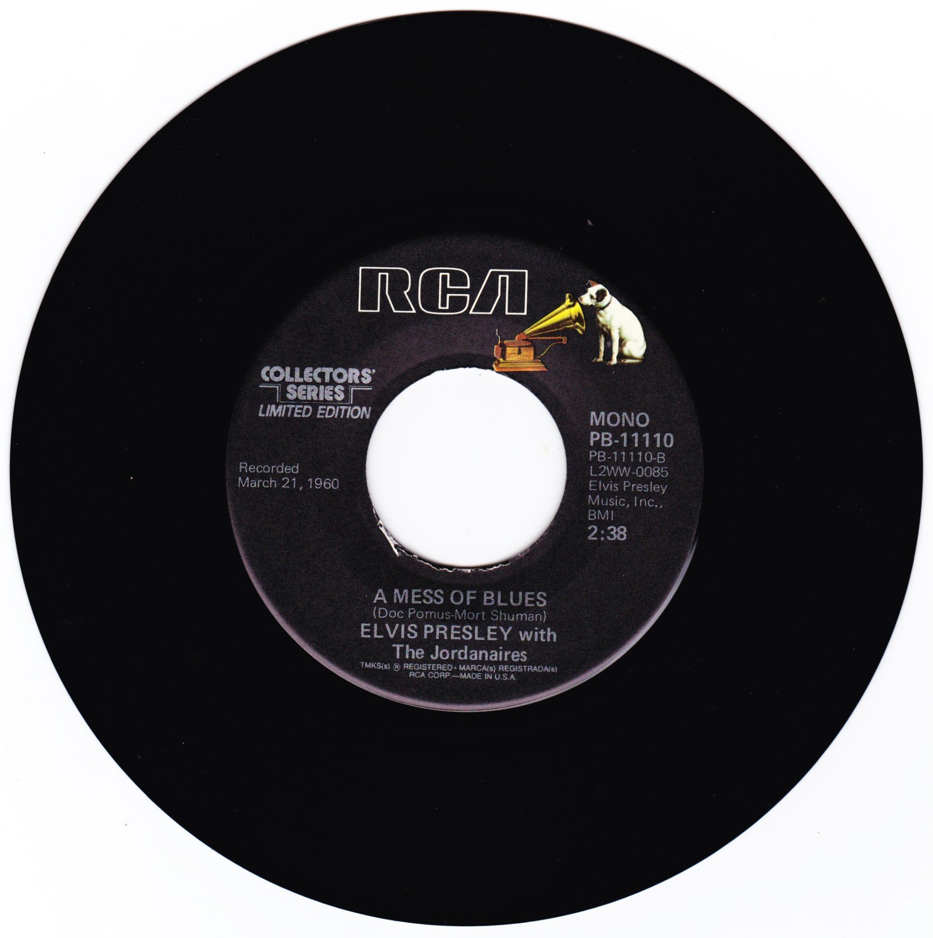 | Details : Reissue with new catalogue number Side A : It's Now Or Never Side B : A Mess Of Blues Front Cover : Picture Sleeve Rear Cover : Picture Sleeve Label : Black Pressing Plant : Indianapolis Matrix Number Side 1 : L2 - WW 0100 - 32S A1 PB - 11110 - A (Machine Stamped) Matrix Number Side 2 : L2 - WW 0085 - 13S A2 PB - 11110 - B (Machine Stamped) *NOTE* PB - 11110 |