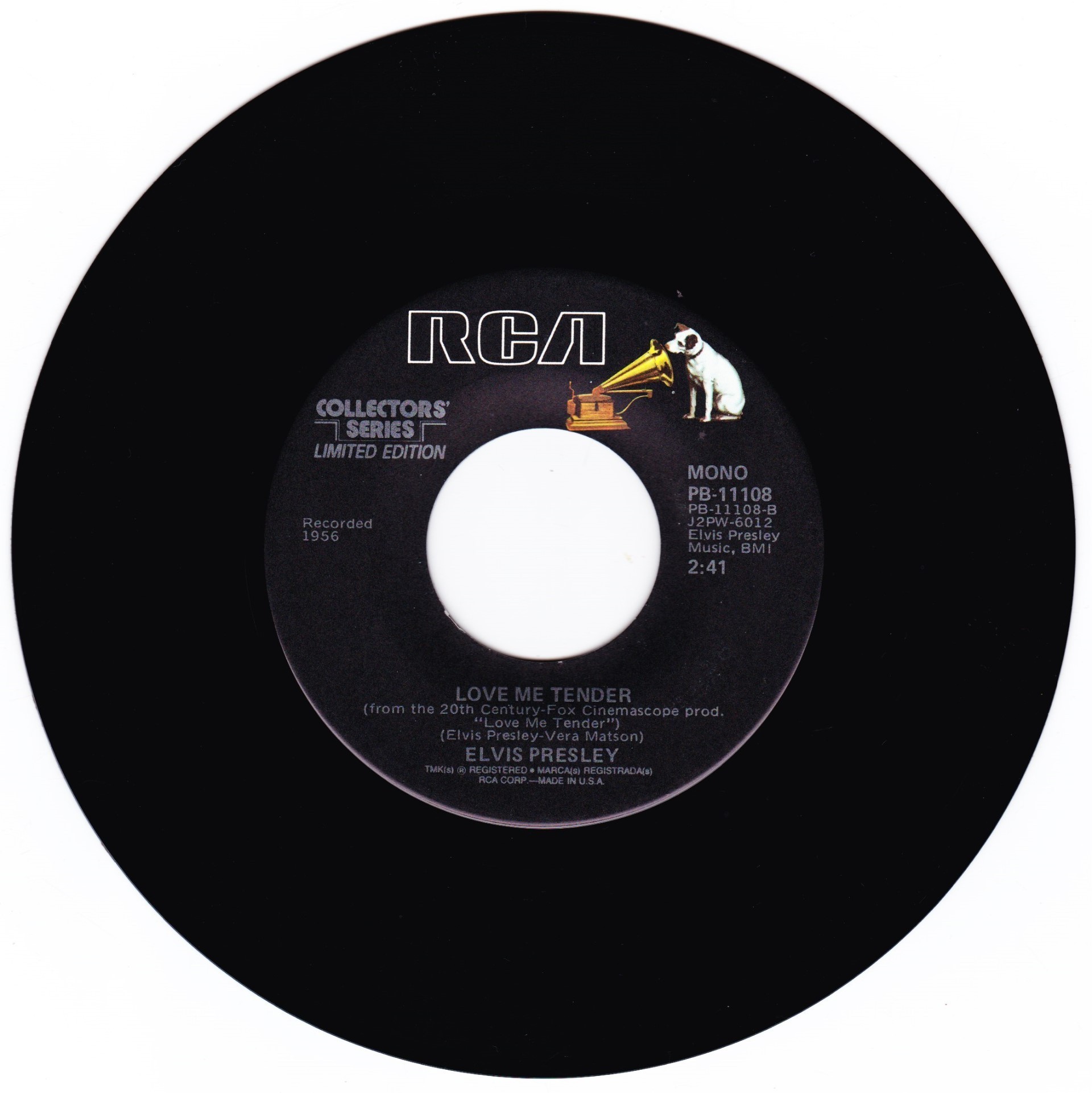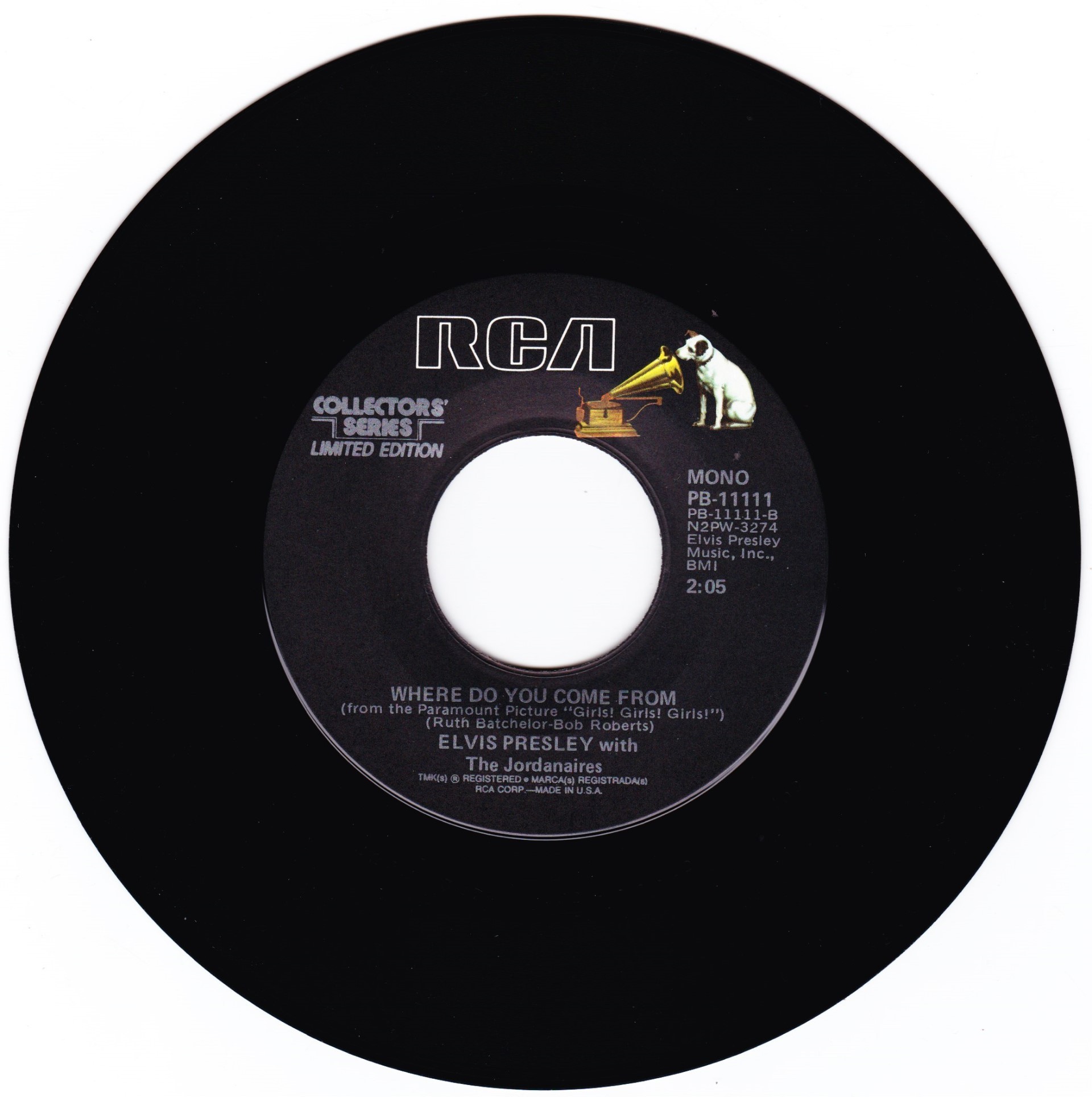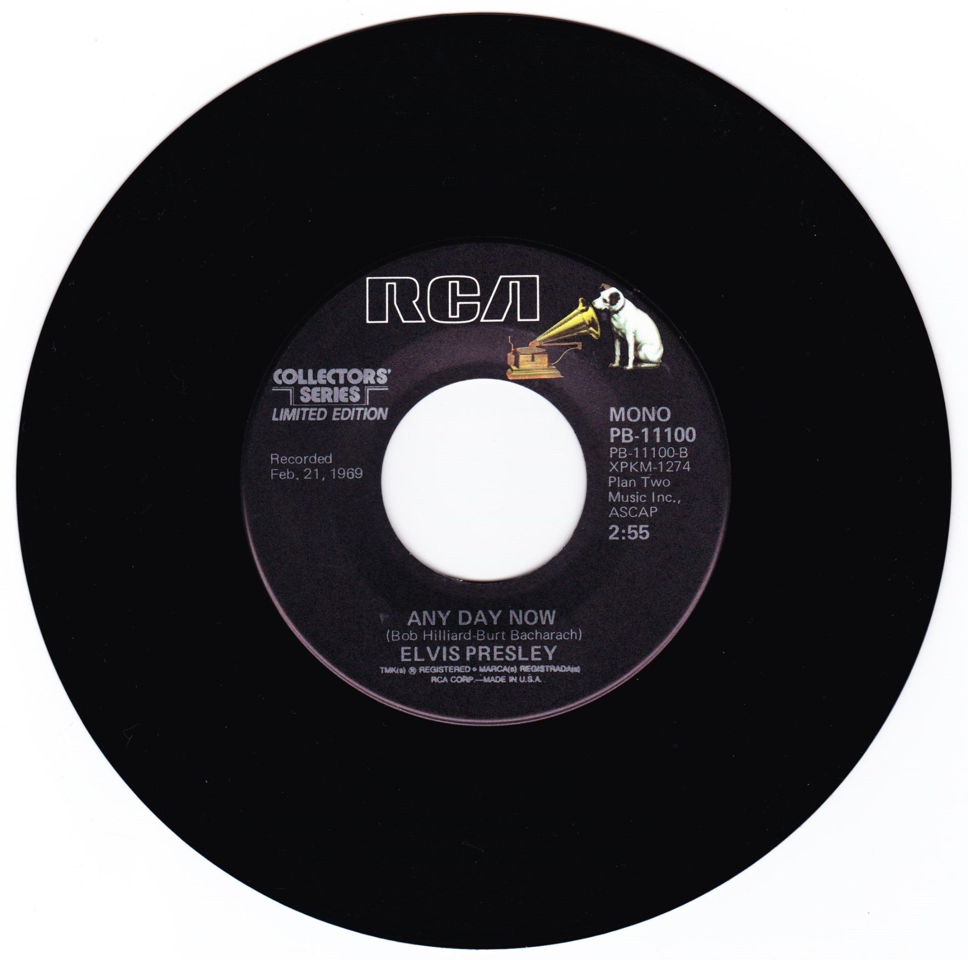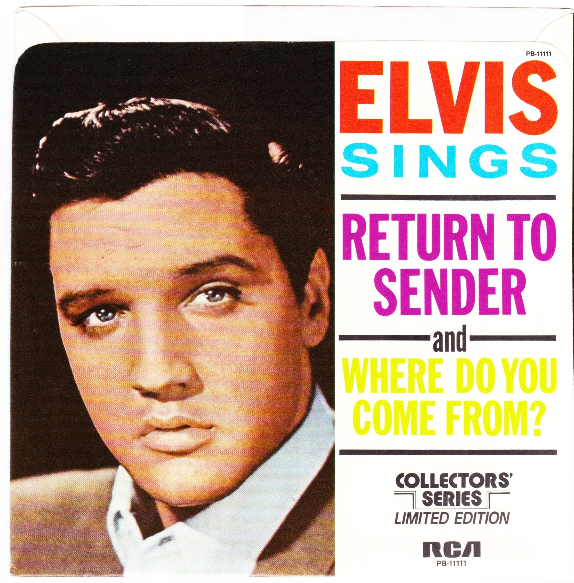| Details : Reissue with new catalogue number Side A : It's Now Or Never Side B : A Mess Of Blues Front Cover : Picture Sleeve Rear Cover : Picture Sleeve Label : Black Pressing Plant : Indianapolis Matrix Number Side 1 : L2 - WW 0100 - 32S A1 PB - 11110 - A (Machine Stamped) Matrix Number Side 2 : L2 - WW 0085 - 13S A2 PB - 11110 - B (Machine Stamped) *NOTE* PB - 11110 |
