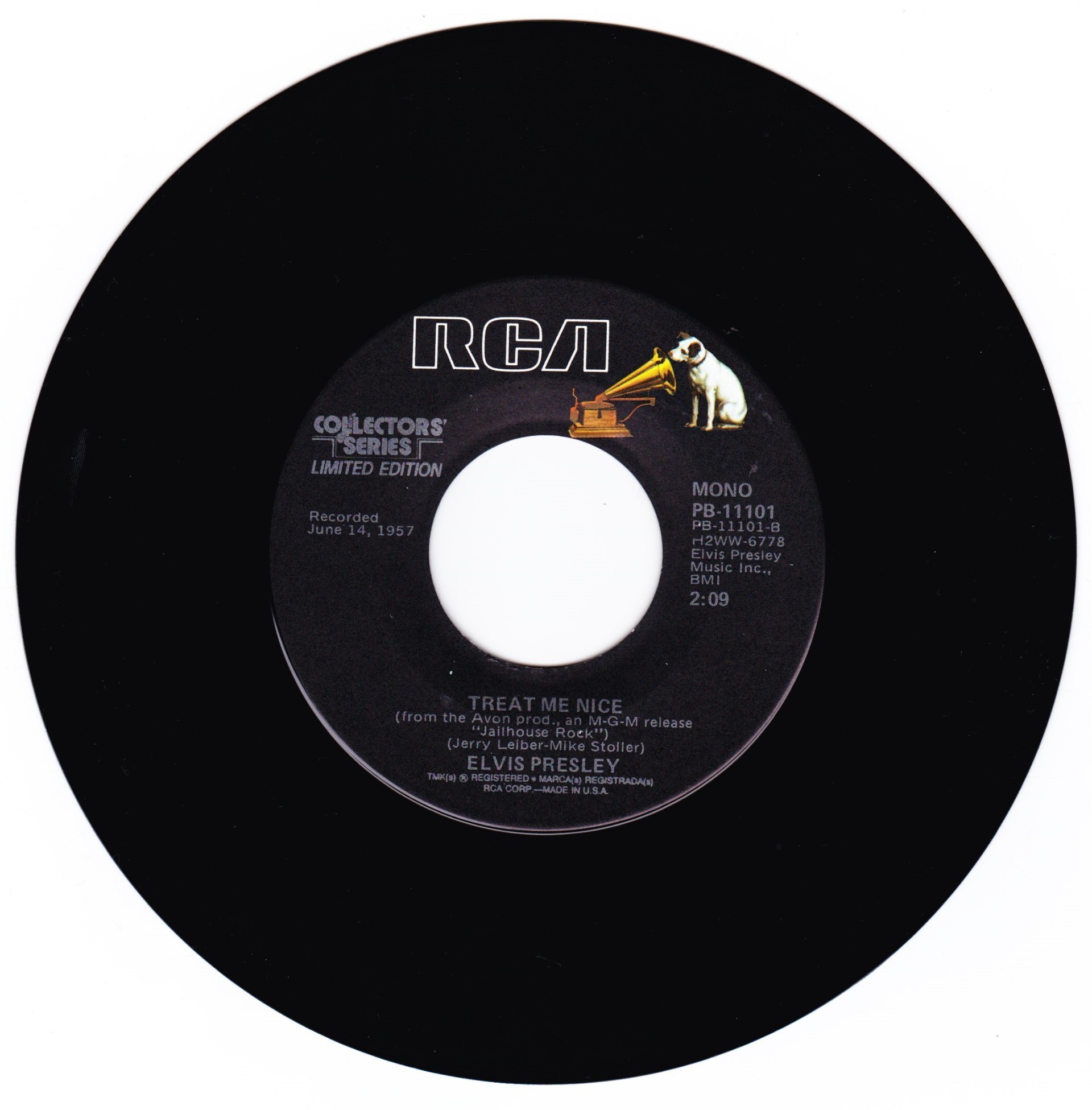 | Details : Reissue with new catalogue number Side A : Jailhouse Rock Side B : Treat Me Nice Front Cover : Picture Sleeve Rear Cover : Picture Sleeve Label : Black Pressing Plant : Indianapolis Matrix Number Side 1 : H2 - WW 6779 - 19S (Machine Stamped) A14 PB - 11101 - A (Hand Etched) Matrix Number Side 2 : H2 - WW 6778 - 18S A3 PB - 11101 - B 1D (Machine Stamped) *NOTE* PB - 11101 |