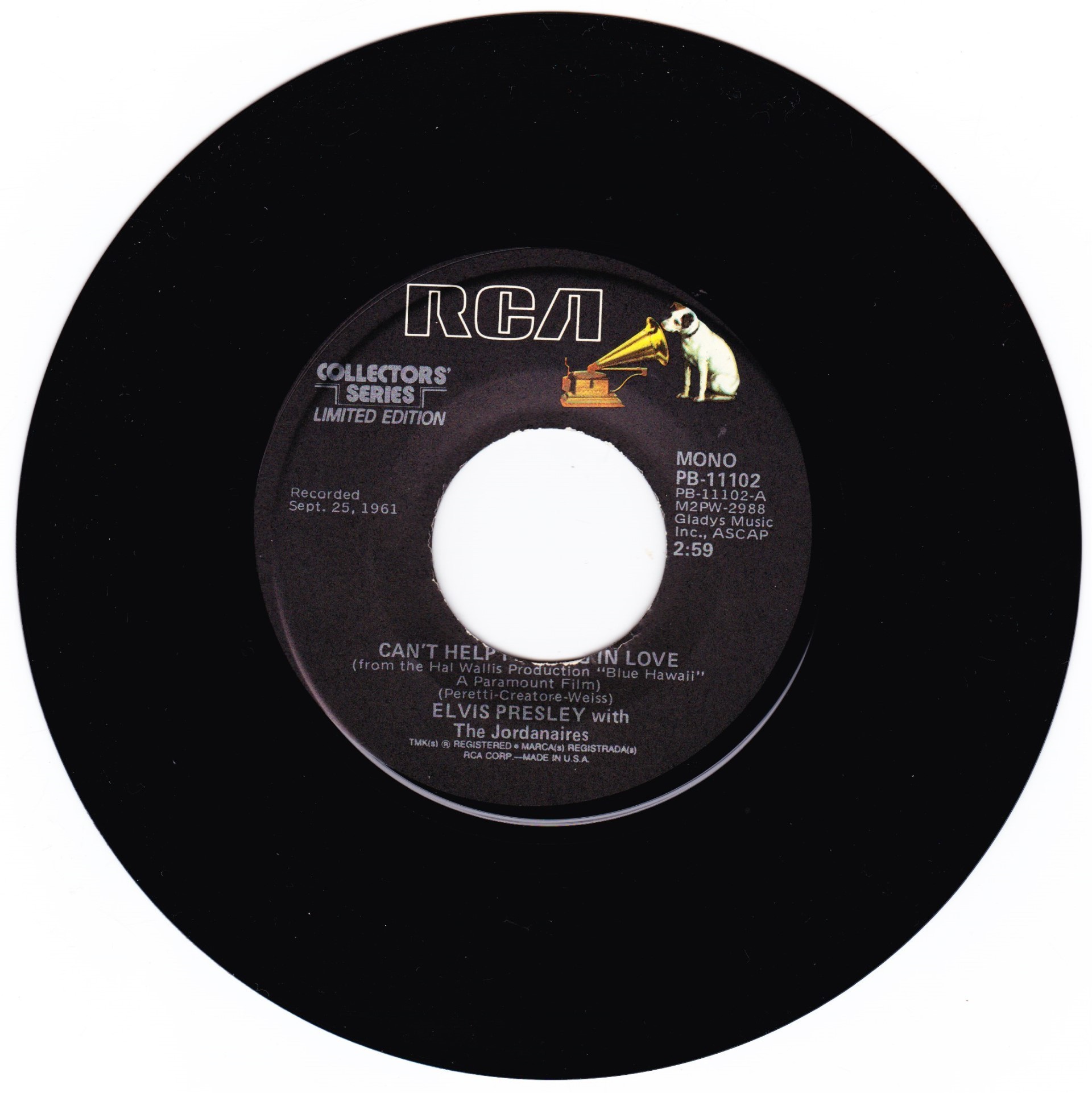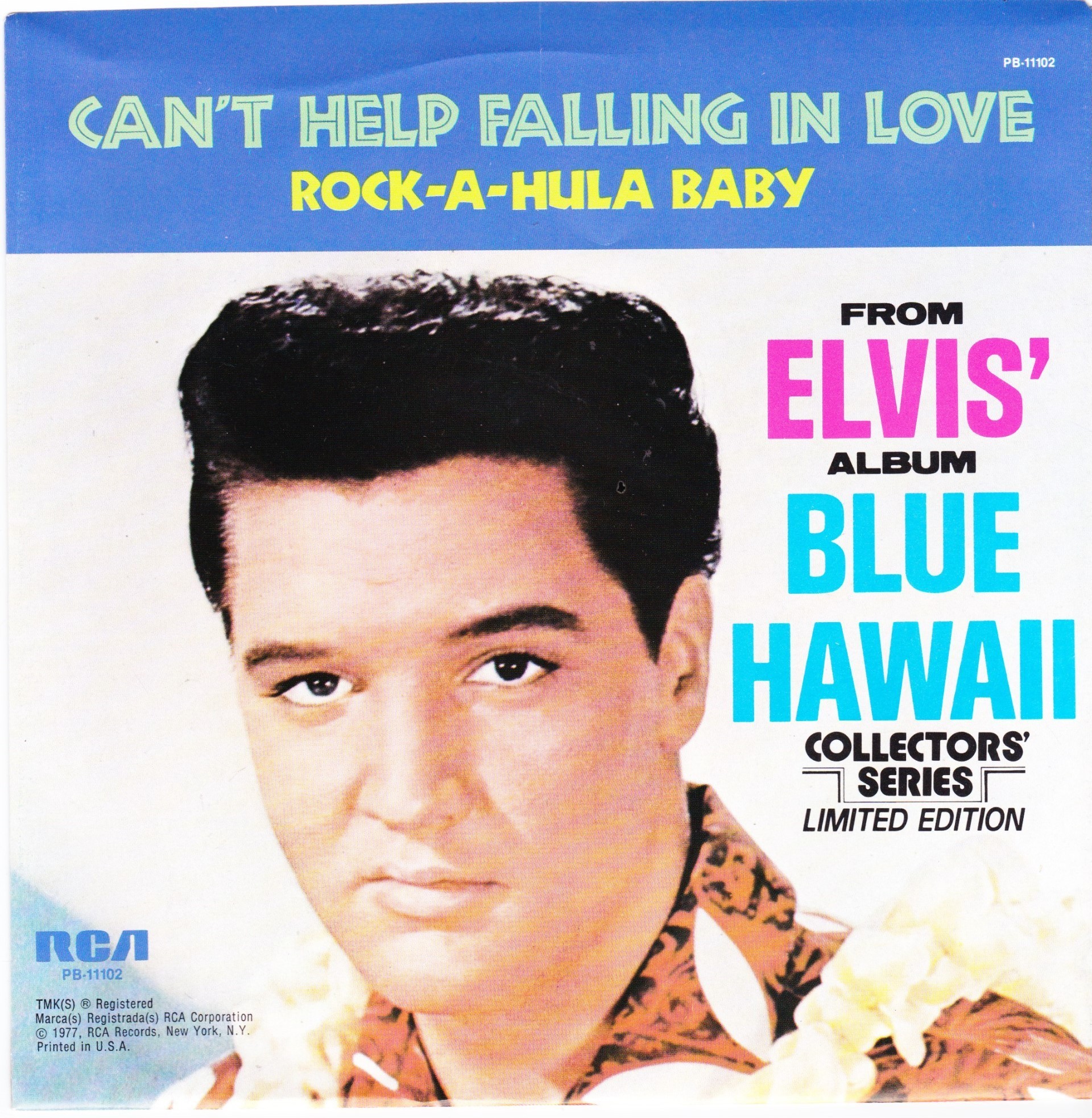 | Details : Reissue with new catalogue number Side A : Can't Help Falling Love Side B : Rock - A - Hula Baby Front Cover : Picture Sleeve Rear Cover : Picture Sleeve Label : Black Pressing Plant : Indianapolis Matrix Number Side 1 : M2 - PW 2988 - 11S A3 PB - 11102 - A (Machine Stamped) Matrix Number Side 2 : M2 - PW 2989 - 10 A4 PB - 11102 - B (Machine Stamped) *NOTE* PB - 11102 |
