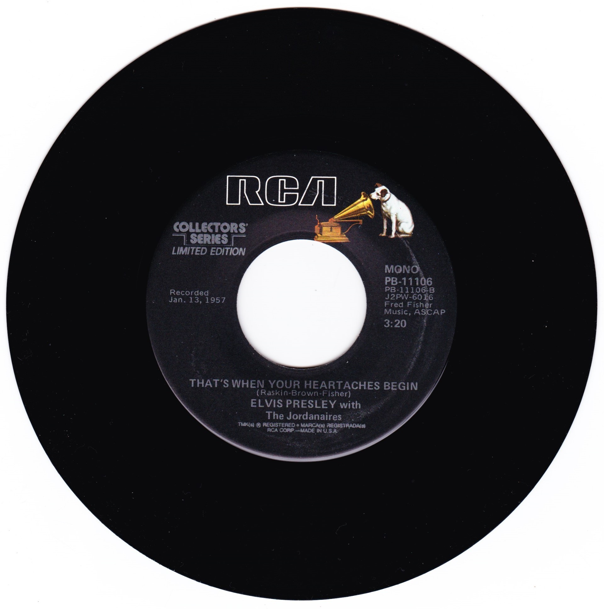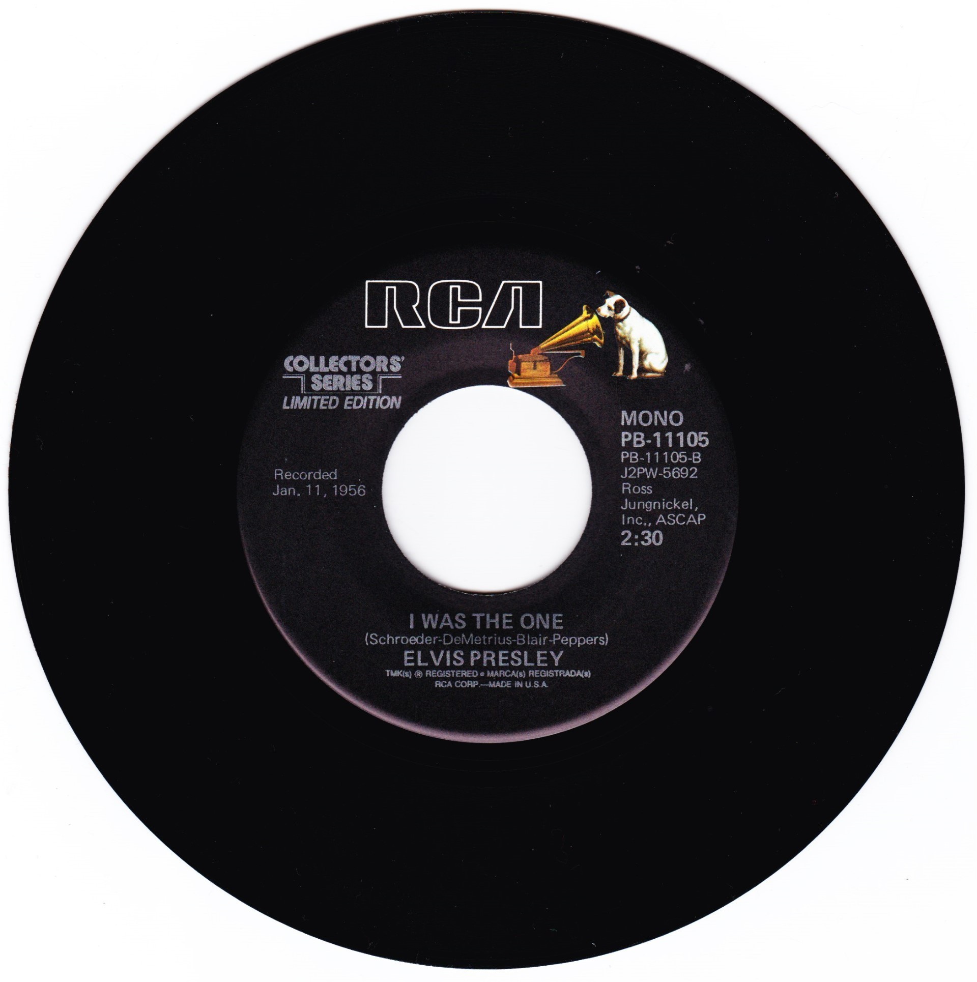 | Details : Reissue with new catalogue number Side A : Heartbreak Hotel Side B : I Was The One Front Cover : Picture Sleeve Rear Cover : Picture Sleeve Label : Black Pressing Plant : Indianapolis Matrix Number Side 1 : J2 - PW 5691 - 9S A2 PB - 11105 - A (Machine Stamped) Matrix Number Side 2 : J2 - PW 5692 - 5S B1 PB - 11105 - B (Machine Stamped) *NOTE* PB - 11105 |