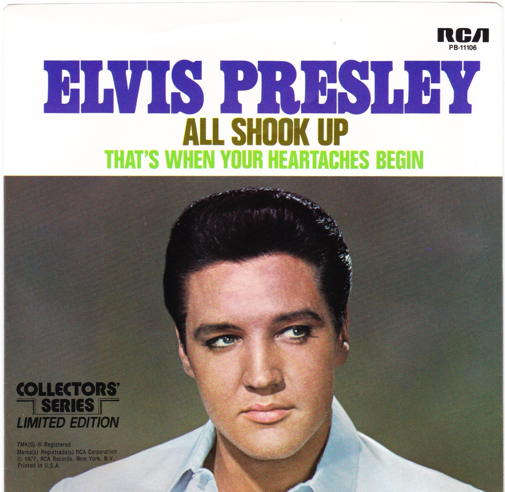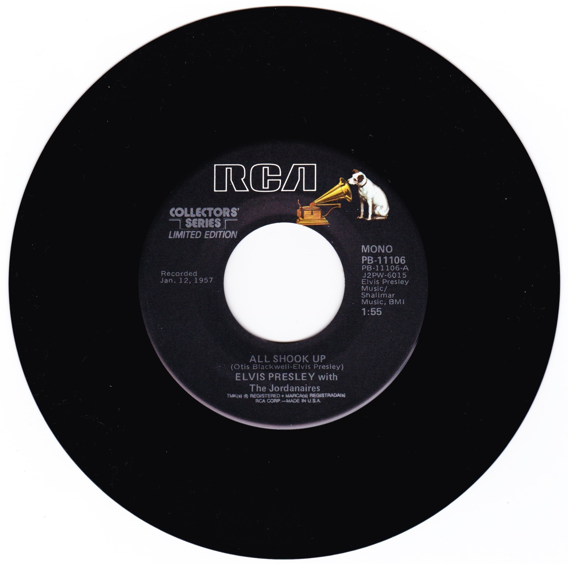 | Details : Reissue with new catalogue number Side A : All Shook Up Side B : That's When Your Heartaches Begin Front Cover : Picture Sleeve Rear Cover : Picture Sleeve Label : Black Pressing Plant : Indianapolis Matrix Number Side 1 : J2 - PW 6015 - 6S A1 PB - 11106 - A (Machine Stamped) Matrix Number Side 2 : J2 - PW 6016 - 7S A3 PB - 11106 - B (Machine Stamped) *NOTE* PB - 11106 |
