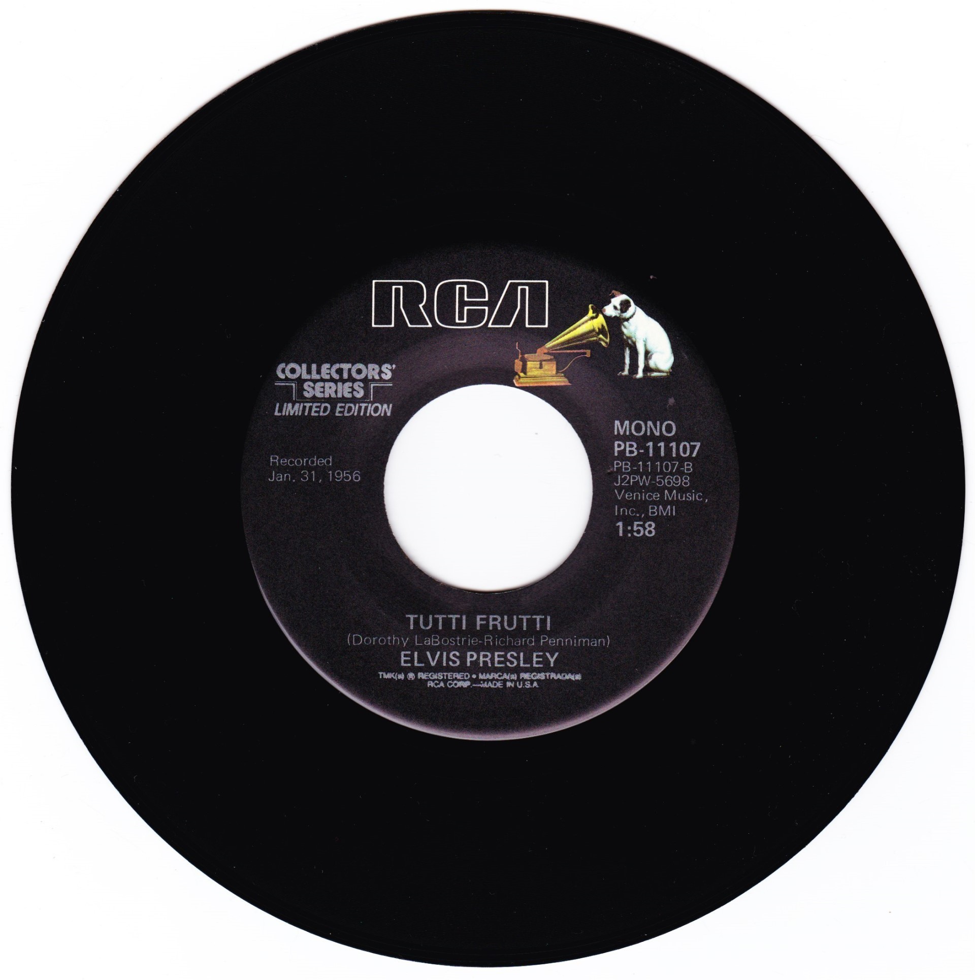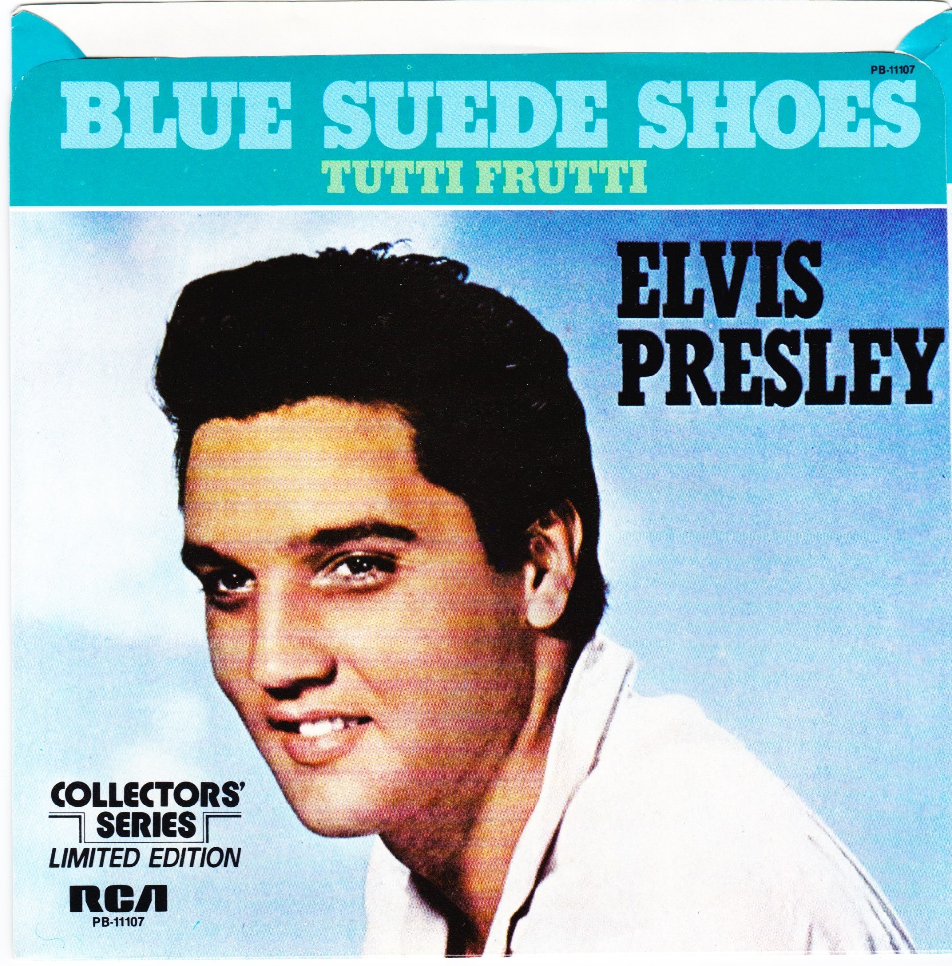 | Details : Reissue with new catalogue number Side A : Blue Suede Shoes Side B : Tutti Frutti Front Cover : Picture Sleeve Rear Cover : Picture Sleeve Label : Black Pressing Plant : Indianapolis Matrix Number Side 1 : J2 - PW 5697 - 5S AC (Machine Stamped) PB - 11107 - A (Hand Etched) Matrix Number Side 2 : J2 - PW 5698 - 6S A1 PB - 11107 - B (Machine Stamped) *NOTE* PB - 11107 |