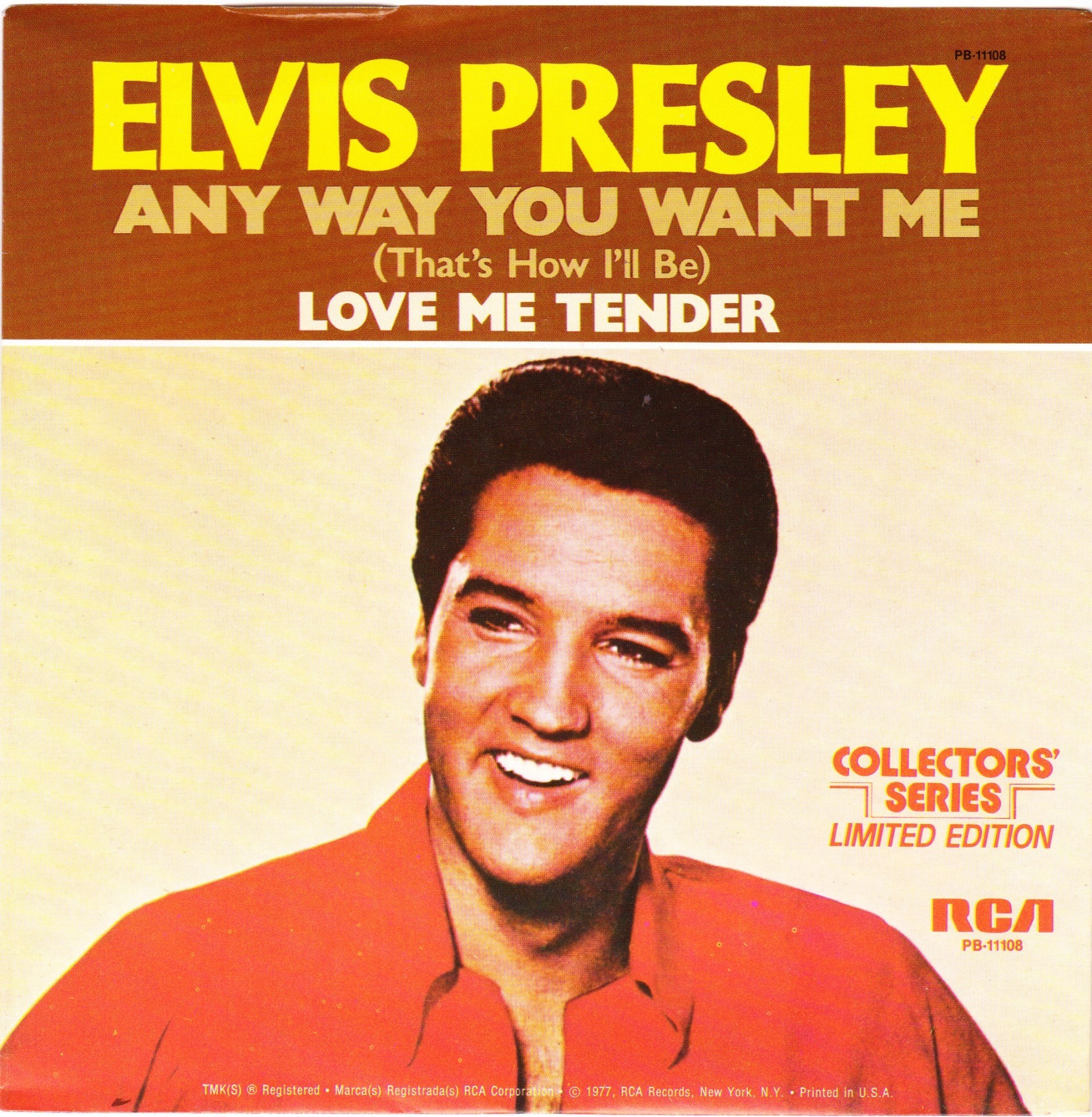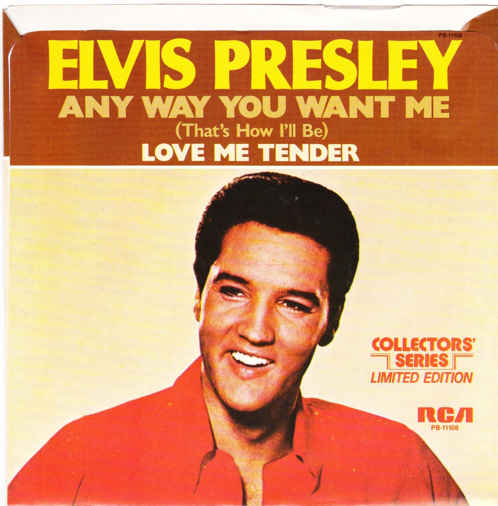 | Details : Reissue with new catalogue number Side A : Any Way You Want Me (That's How I'll Be) Side B : Love Me Tender Front Cover : Picture Sleeve Rear Cover : Picture Sleeve Label : Black Pressing Plant : Indianapolis Matrix Number Side 1 : J2 - PW 6011 - 7S B2 PB - 11108 - A (Machine Stamped) Matrix Number Side 2 : J2 - PW 6012 - 7 A5 PB - 11108 - B (Machine Stamped) *NOTE* PB - 11108 |