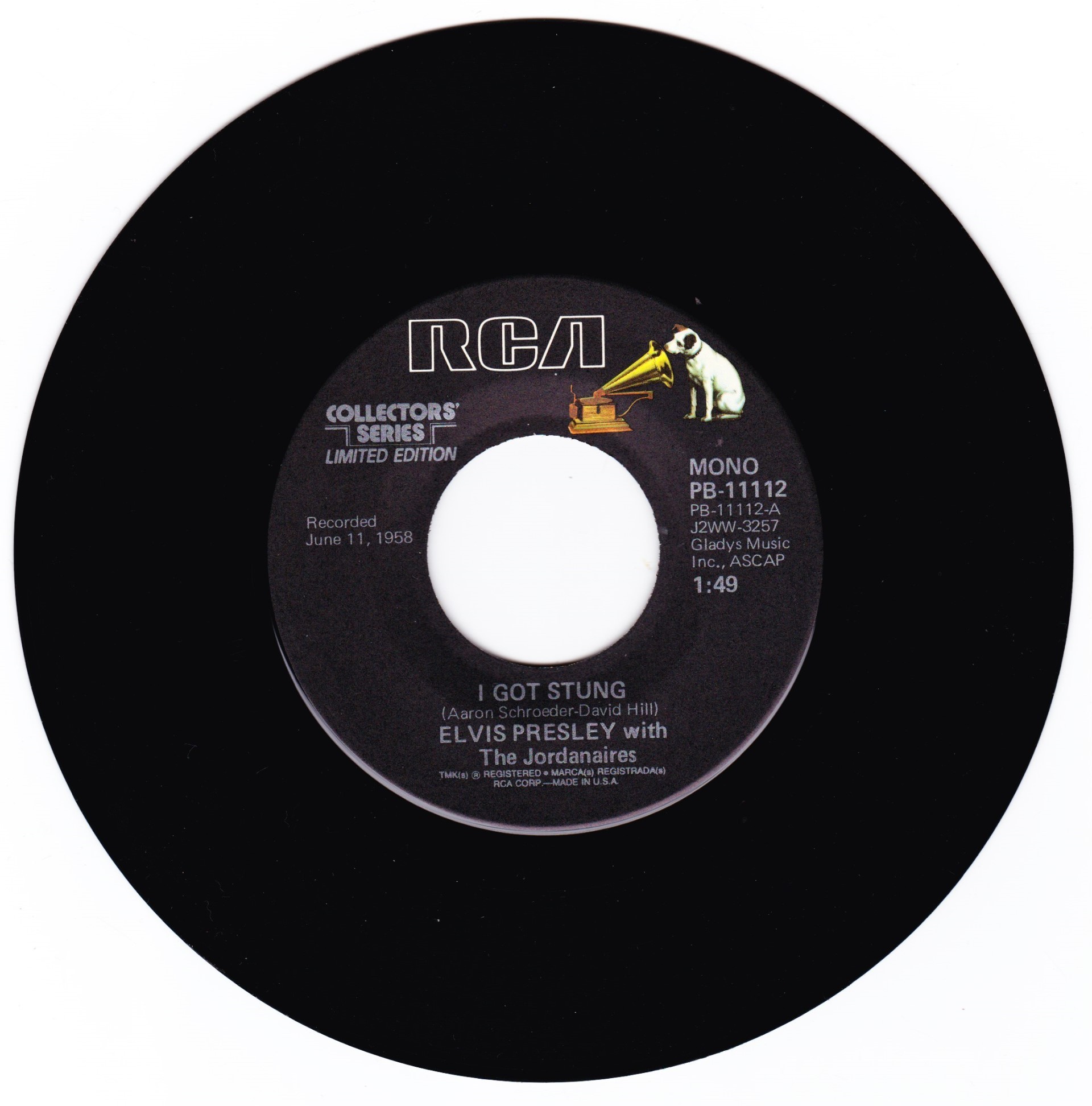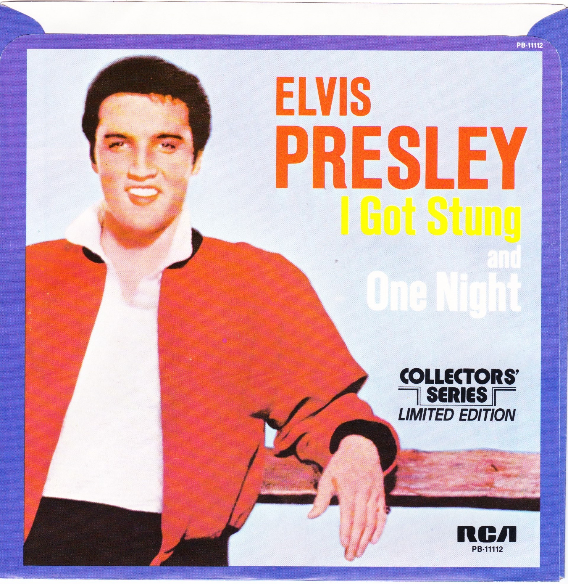 | Details : Reissue with new catalogue number Side A : I Got Stung Side B : One Night Front Cover : Picture Sleeve Rear Cover : Picture Sleeve Label : Black Pressing Plant : Indianapolis Matrix Number Side 1 : J2 - WW 3257 - 13S AC A (Machine Stamped) PB - 11112 - A (Hand Etched) Matrix Number Side 2 : H2 - WW 0415 - 13S A2 PB - 11112 - B (Machine Stamped) *NOTE* PB - 11112 |