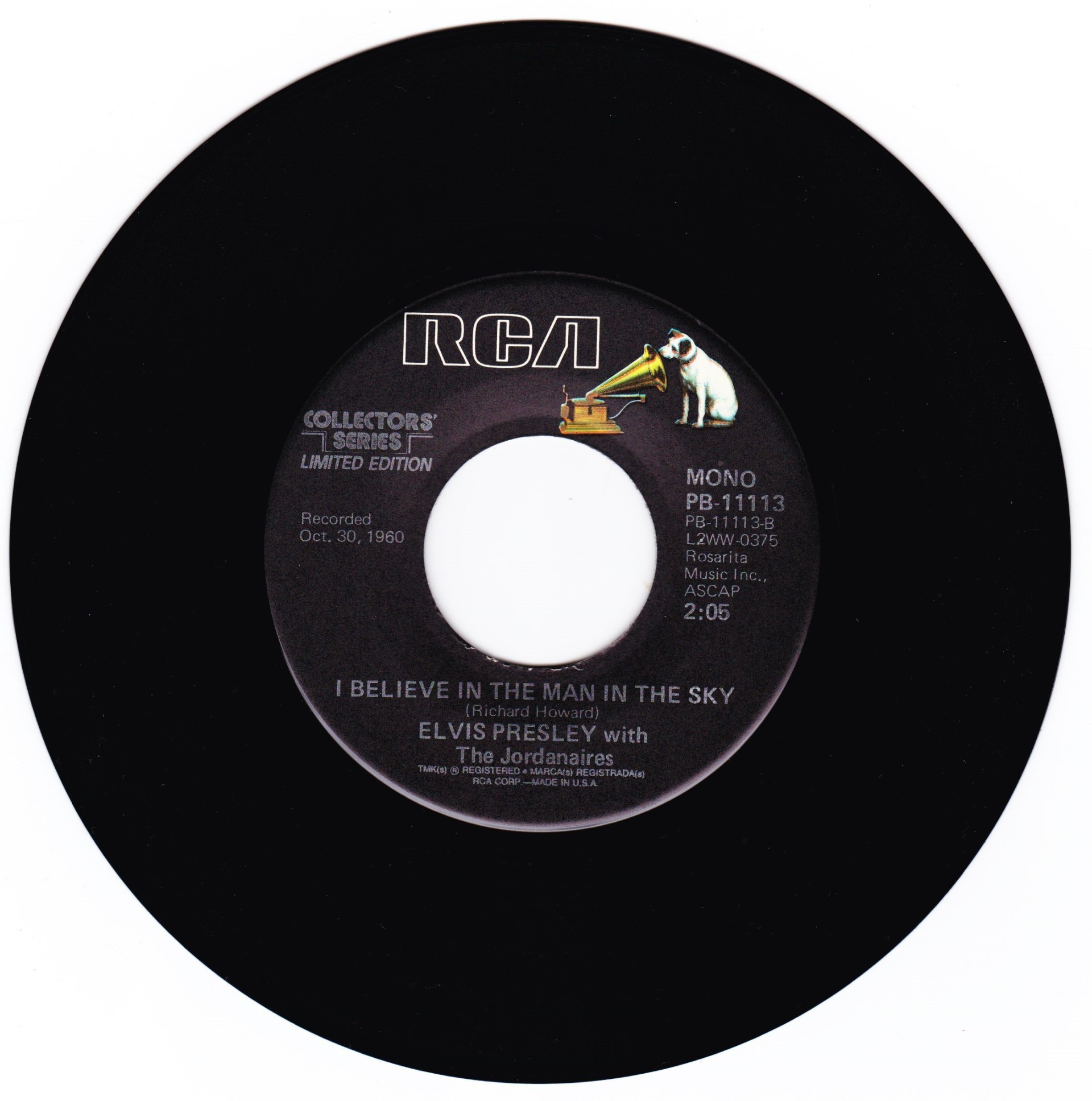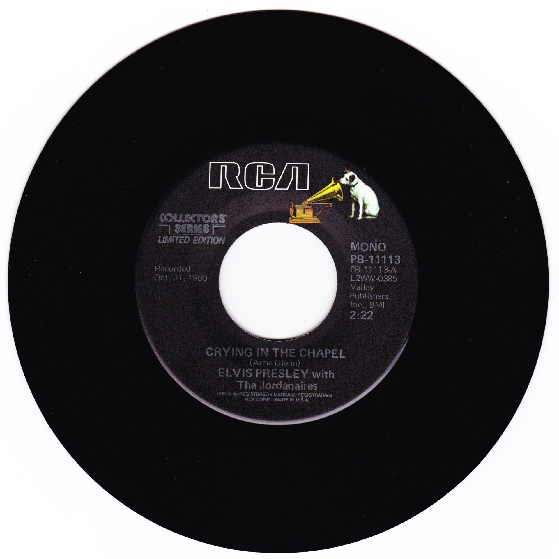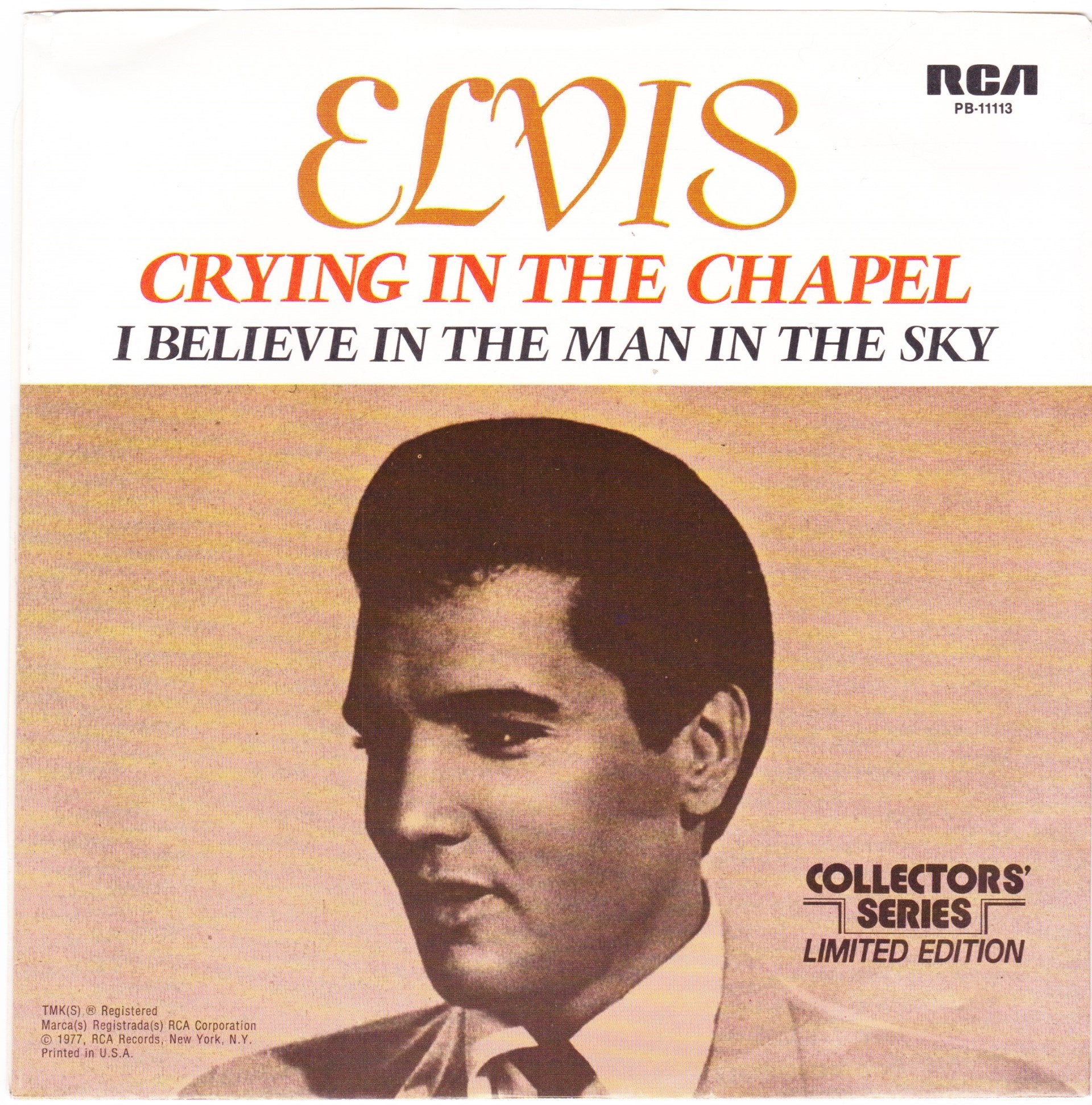 | Details : Reissue with new catalogue number Side A : Crying In The Chapel Side B : I Believe In The Man In The Sky Front Cover : Picture Sleeve Rear Cover : Picture Sleeve Label : Black Pressing Plant : Indianapolis Matrix Number Side 1 : L2 - WW 0385 - 11S A1 PB - 11113 - A (Machine Stamped) Matrix Number Side 2 : L2 - WW 0375 - 11S A2 PB - 11113 - B (Machine Stamped) *NOTE* PB - 11113 |