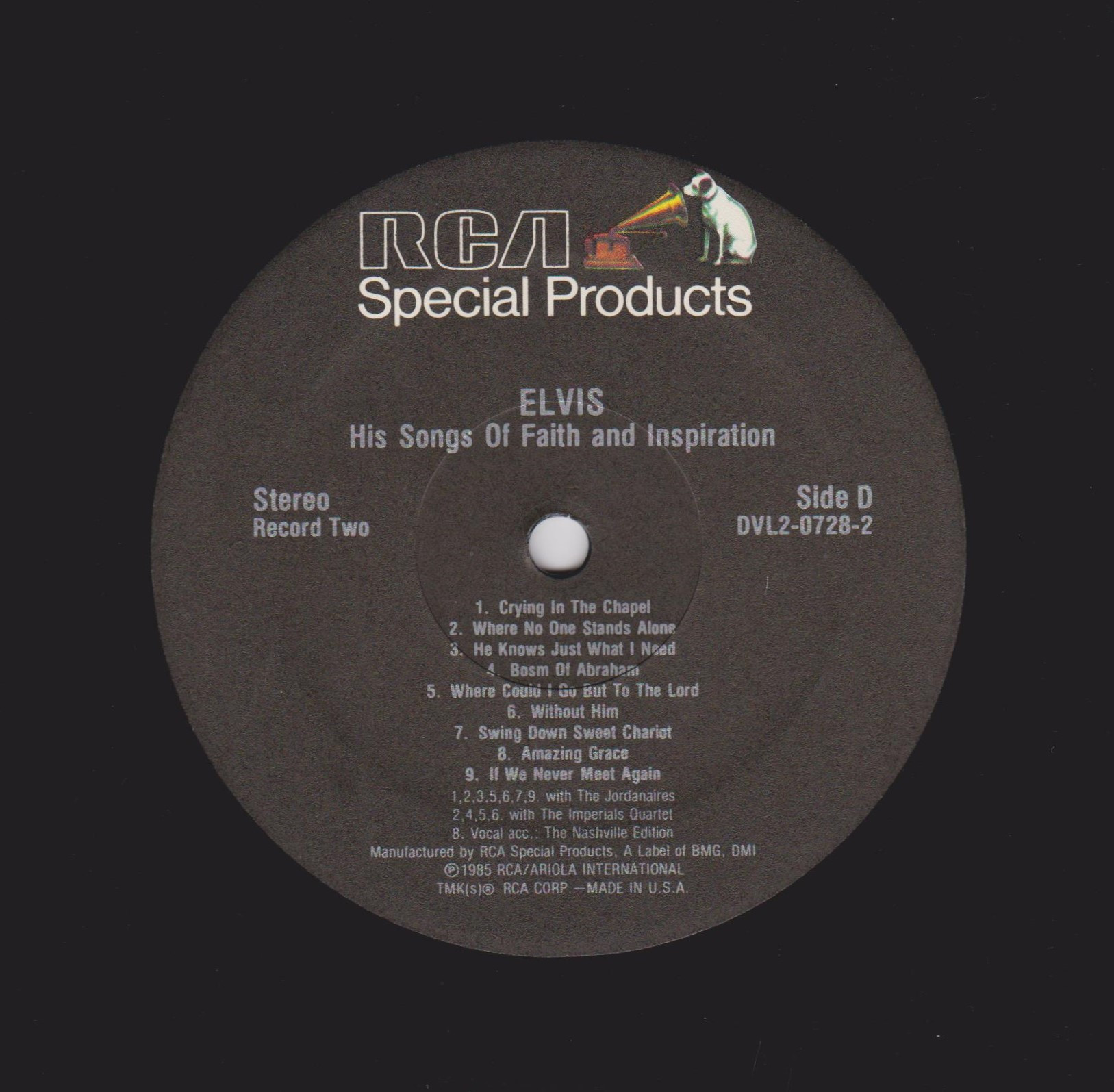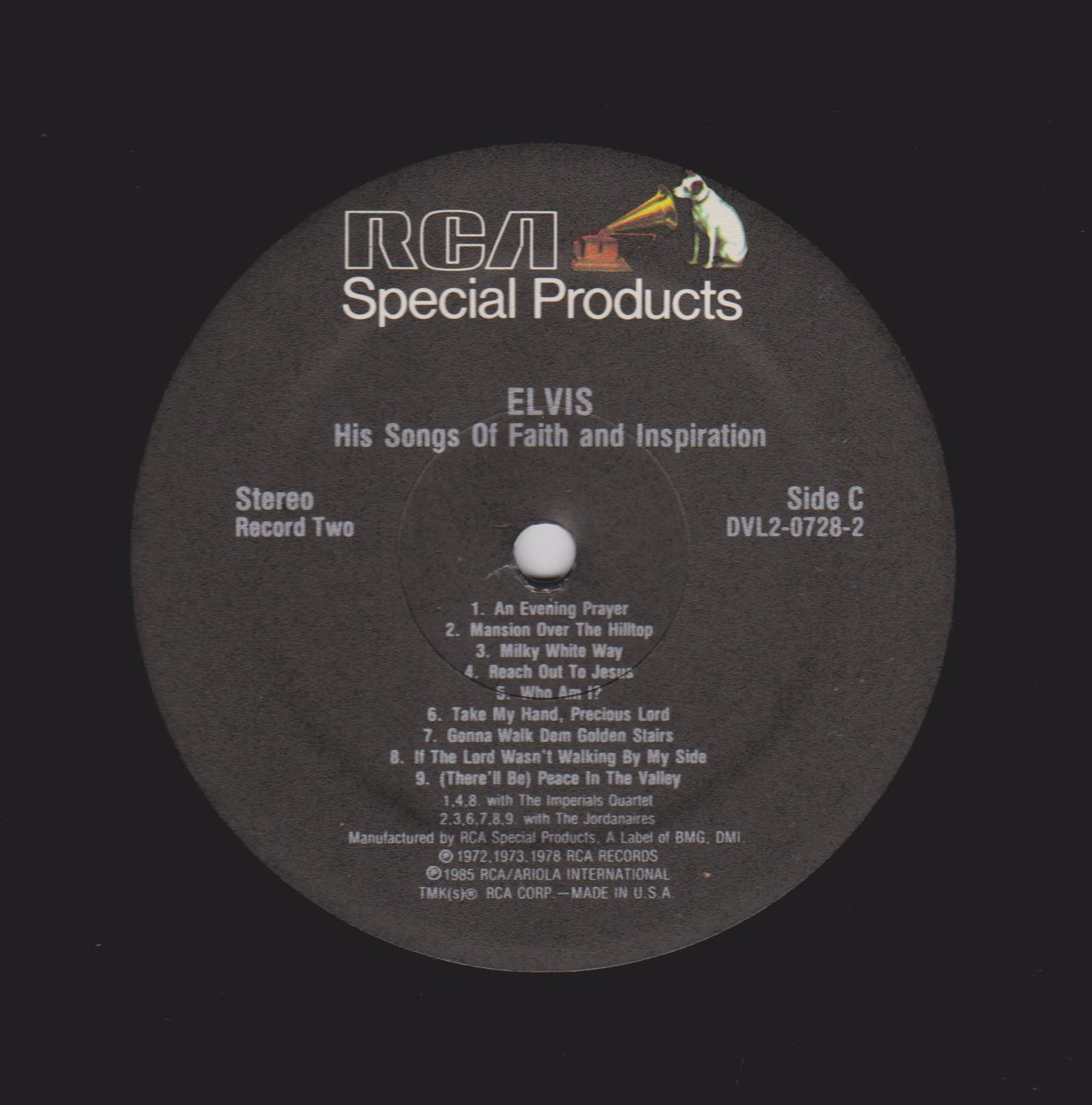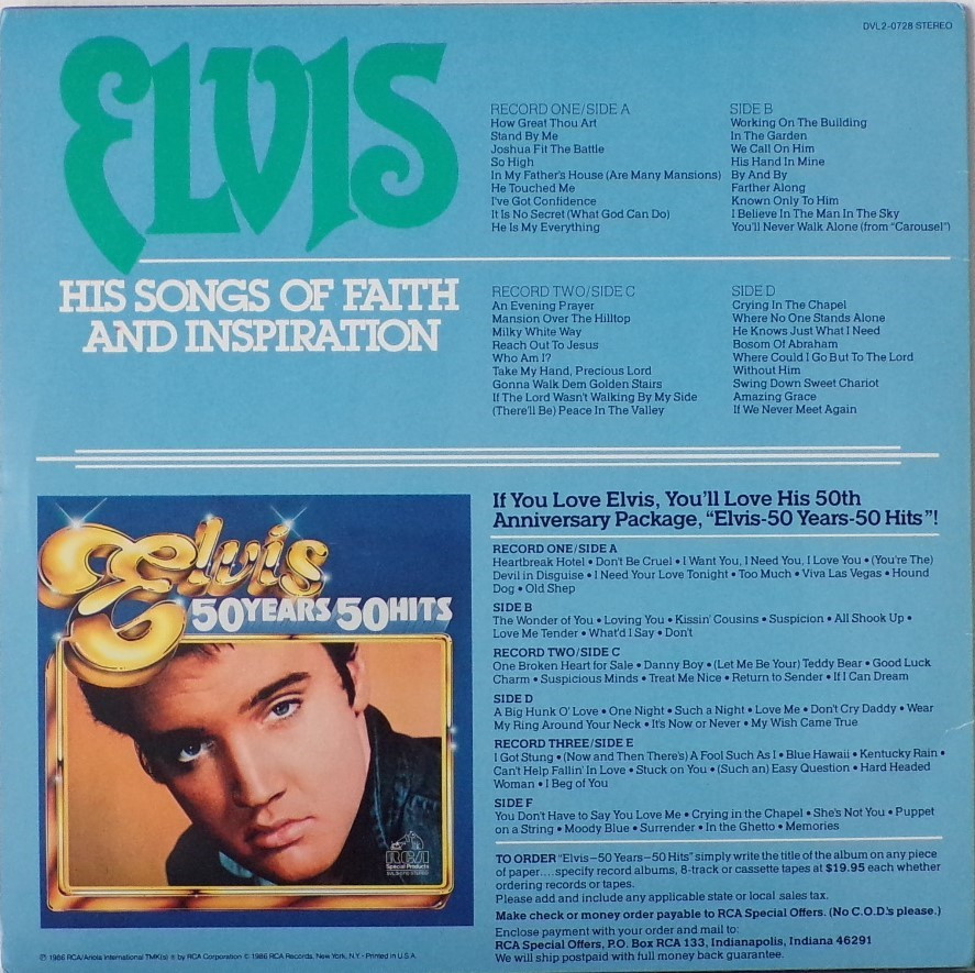 One Side A : Record One Side B : Record Two Side C : Record Two Side D : Brief History: This album set was only available through an RCA television mail order ad. It was available for approximately 3 months and then deleted. This 2 record set contains 36 of Elvis' most beloved gospel songs. Details : 1986 Release |