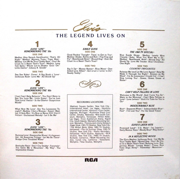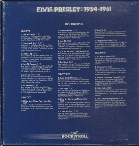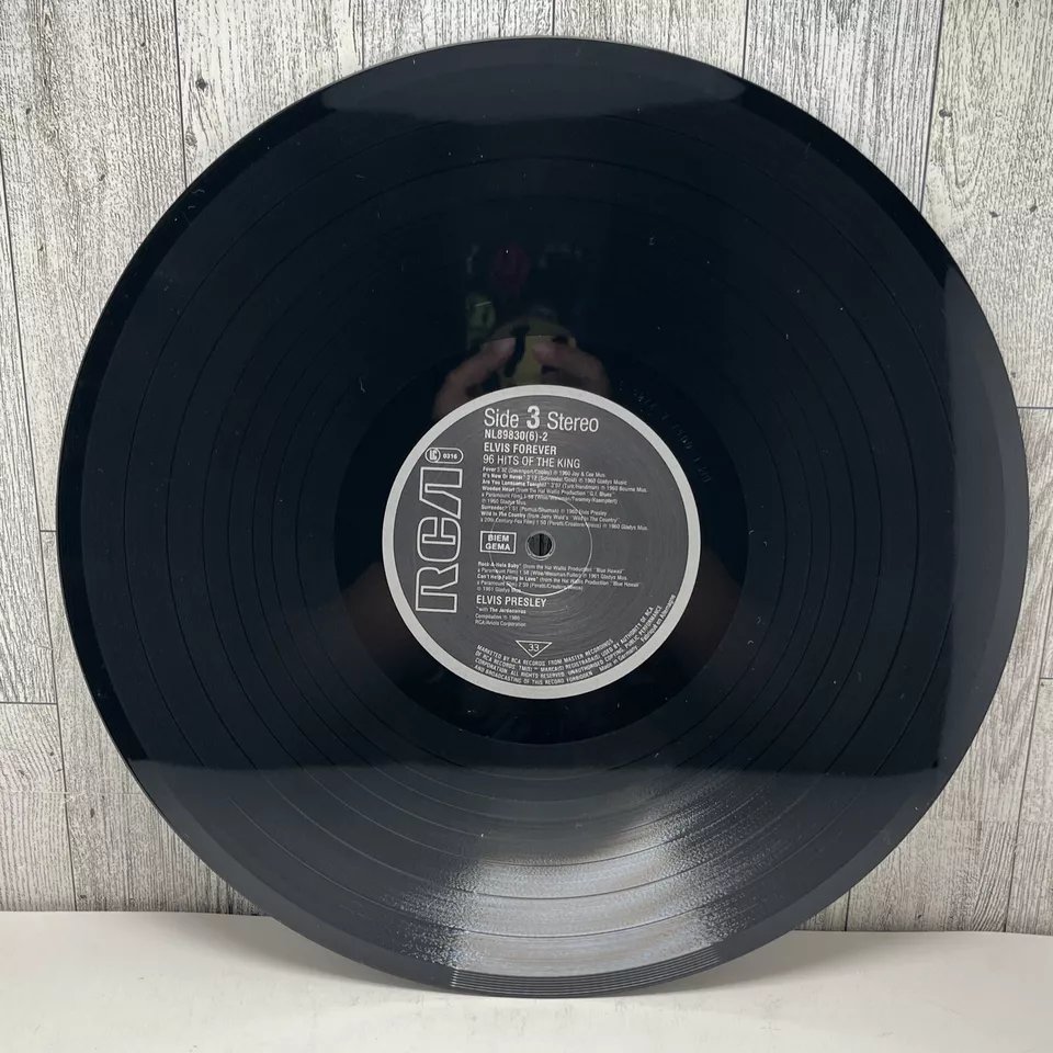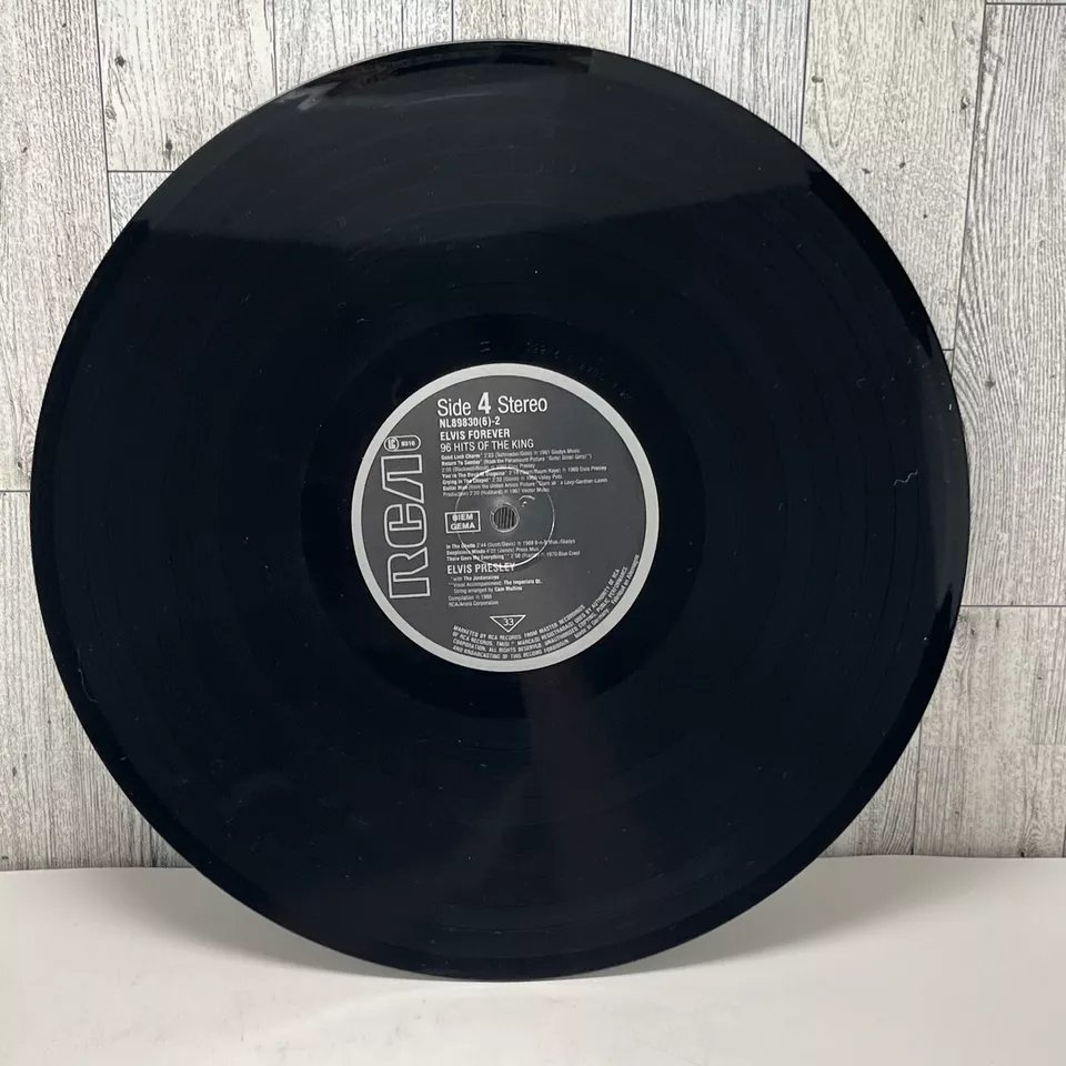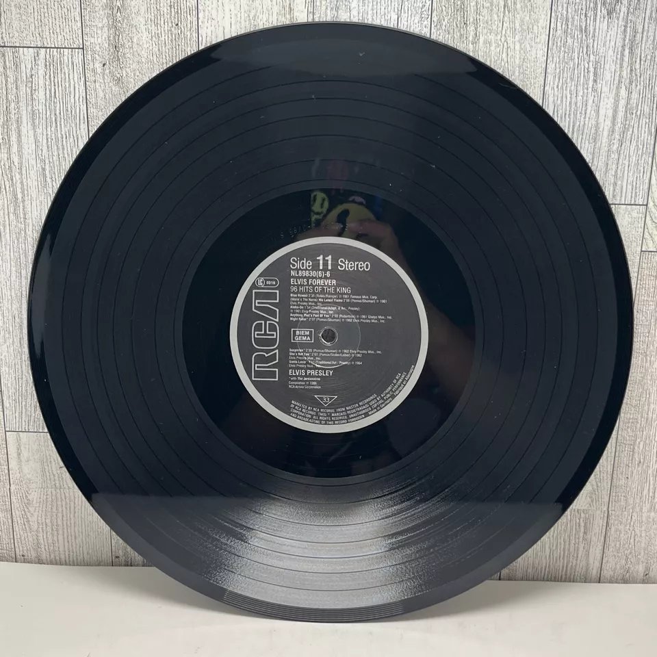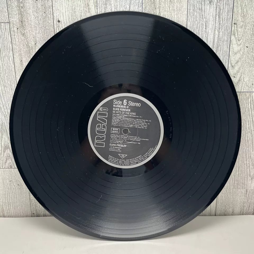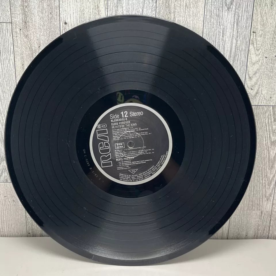 RCA – NL 89 830 (6) 01: My Baby Left Me 02: Heartbreak Hotel 03: Blue Suede Shoes 04: Hound Dog 05: Love Me Tender 06: Got A Lot O' Livin' To Do! 07: (Let Me Be Your) Teddy Bear 08: I'm All Shook Up Side 2: 01: Don't 02: Hard Headed Woman 03: King Creole 04: Jailhouse Rock 05: A Big Hunk O' Love 06: I Got Stung 07: One Night 08: Stuck On You Side 3: 01: Fever 02: It's Now Or Never 03: Are You Lonesome Tonight? 04: Wooden Heart 05: Surrender 06: Wild In The Country 07: Rock-A-Hula Baby 08: Can't Help Falling In Love Side 4: 01: Good Luck Charm 02: Return To Sender 03: You're The Devil In Disguise 04: Crying In The Chapel 05: Guitar Man 06: In The Ghetto 07: Suspicious Minds 08: There Goes My Everything Side 5: 01: Don't Be Cruel (To A Heart That's True) 02: I Want You, I Need You, I Love You 03: Too Much 04: Loving You 05: Treat Me Nice 06: I Beg Of You 07: Ain't That Loving You Baby 08: Wear My Ring Around Your Neck Side 6: 01: Such A Night 02: A Mess Of Blues 03: I Gotta Know 04: Kiss Me Quick 05: Little Sister 06: No More (La Paloma) 07: I Feel So Bad 08: King Of The Whole Wide World 09: (Such An) Easy Question Side 7: 01: Bossa Nova Baby 02: Mexico 03: Witchcraft 04: What'd I Say 05: Kissin' Cousins 06: Viva Las Vegas 07: Ask Me 08: It Hurts Me Side 8: 01: I've Lost You 02: I Just Can't Help Believin' 03: Love Letters 04: You Don't Have To Say You Love Me 05: The Wonder Of You 06: Burning Love 07: My Way Side 9: 01: Blue Moon 02: Money Honey 03: I Got A Woman 04: Tutti Frutti 05: Long Tall Sally 06: Blueberry Hill 07: Mean Woman Blues 08: Your Cheatin' Heart Side 10: 01: Dixieland Rock 02: (Now And Then There's) A Fool Such As I 03: Lover Doll 04: Doncha' Think It's Time 05: Make Me Know It 06: Fame And Fortune 07: The Girl Of My Best Friend 08: Lonely Man Side 11: 01: Blue Hawaii 02: (Marie's The Name) His Latest Flame 03: Aloha - Oe 04: Anything That's Part Of You 05: Night Rider 06: Suspicion 07: She's Not You 08: Santa Lucia Side 12: 01: (It's A) Long Lonely Highway 02: Please Don't Drag That String Around 03: Memphis, Tennessee 04: Little Egypt 05: Do The Clam 06: Indescribably Blue 07: Gentle On My Mind 08: Any Day Now Distributed By – RCA, Ariola Phonographic Copyright ℗ – RCA Schallplatten GmbH Copyright © – RCA Schallplatten GmbH Comes with a plastic "3D-Poster".Rights Society: BIEM and GEMA Label Code: LC 0316Elvis Forever 96 Hits Of The King NL 89 830 (6) |