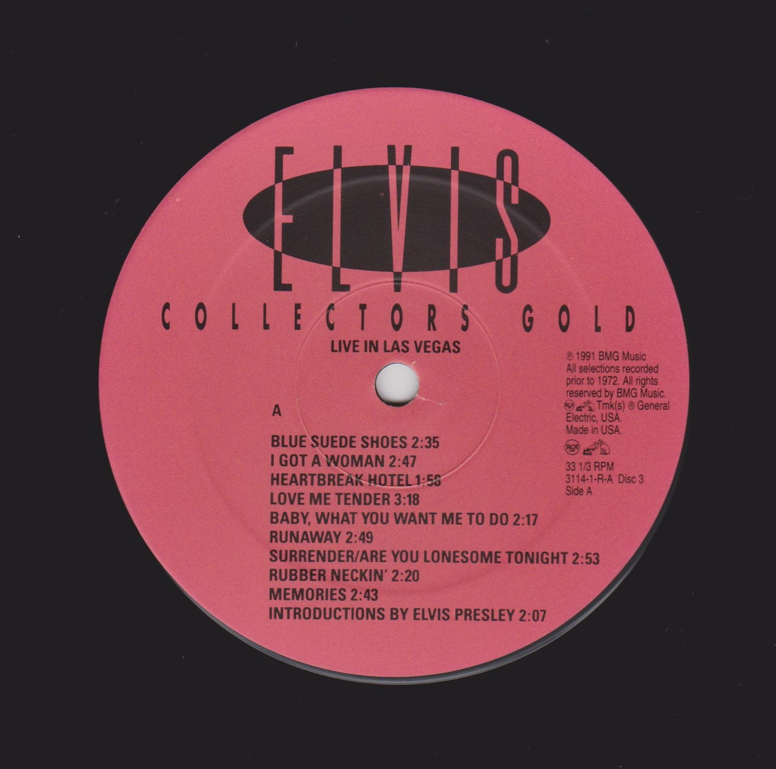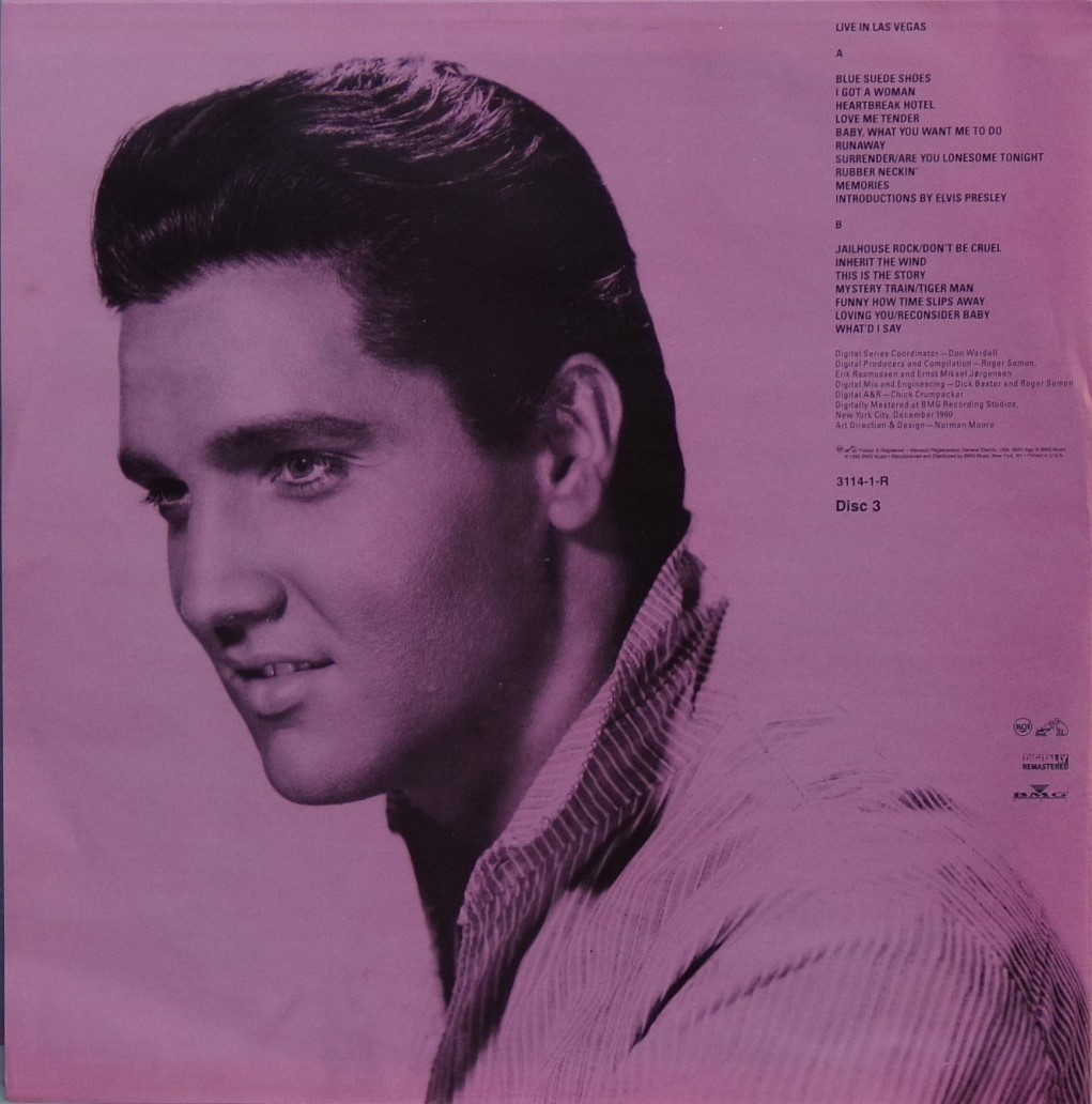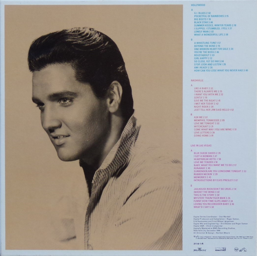 GOLD (US) RCA 3114-1-R (LP) (US) RCA 3114-2-R (CD) Released: August 1991 Record One Side A Hollywood : Record One Side B Hollywood : Record Two Side A Nashville : Record Two Side B Nashville : Record Three Side A Live In Las Vegas : Record Three Side B Live In Las Vegas : Brief History : A 3 LP box set RCA BMG that is very rare. There was a limited national edition of 10,000 printed. RCA then decided not to go along with the campaign. Most were destroyed. but some got out by workers and RCA executives. It contains 'Hollywood', 'Nashville' and 'Live In Las Vegas' albums, housed in 12" x 12" picture box complete with an 8-page booklet. I have number 0005146. |