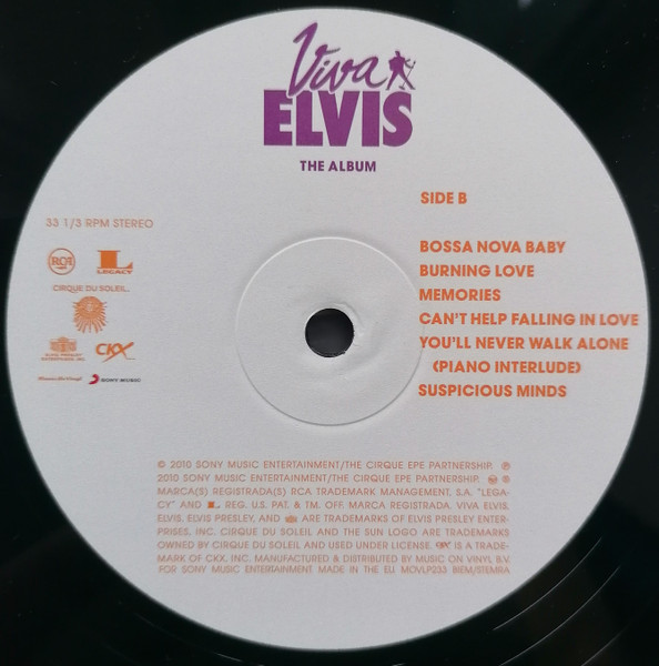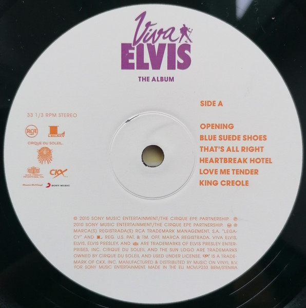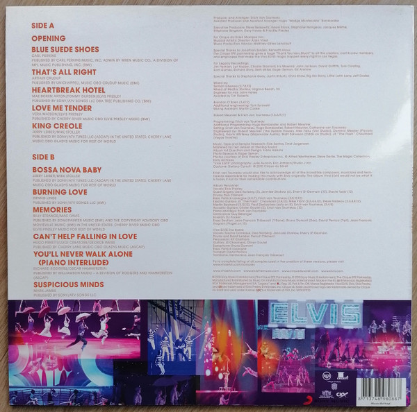 B: Arranged By – Erich Van Tourneau. [Asst] – Hugo Bombardier New remixed versions of classic Elvis tracks for the Cirque Du Soleil show in Las Vegas. Brief History : During the '50s and '60s, there was no bigger extravaganza in pop music than an Elvis Presley concert, whether it was 1956 in Fort Wayne, IN or 1969 at the International Hotel in Las Vegas, where he eventually appeared to more than two million paying fans. Forty years after he debuted at the International, the Cirque du Soleil show Viva Elvis presented a similar extravaganza, this one complete with dance, acrobatics, live music, and video clips -- that list prioritized, no doubt, in order of importance.After all, an extravaganza in 2010 terms is quite different than 50 years earlier, especially when the star of your show isn't around to ignite the fans. Still, musical producer Erich van Tourneau displays a good working knowledge of Elvis' career arc (thanks in part to preeminent Elvis historian Ernst Jorgensen), and the chronology of Elvis' life is preserved surprisingly well, complete with his energetic rock & roll beginnings, zesty but insubstantial pop for the film soundtracks, and his latter-day apotheosis via rock music and stagecraft. The long-build opening comes courtesy of "Also Sprach Zarathustra," Elvis' opening music for years, before the show launches into "Blue Suede Shoes." Here comes the first clear sign that this is a 2010 production. Every element of the original that can be tweaked, or laden with echo, or resampled, or gated, or scratched by DJ Pocket, is given over to those effects. It sounds like what it is: a musical production that is naturally subservient to its visual accompaniment. Literally every second of the song is devoted to its own moment, with little in the way of build or release -- only peak. From there, Viva Elvis: The Album rewinds Elvis' story to the beginning, with his first major hit, "That's All Right." (Iggy Pop fans may note that it's retro-fitted to sound like a "Lust for Life" knock-off.) "Heartbreak Hotel" is given some riotous, bluesy harmonica and distorted vocals, then the show fittingly uses "Love Me Tender" to portray his Army years, with a female duet partner and photographs of him in uniform. The soundtrack years include "King Creole" and "Bossa Nova Baby," fair choices to feature the frothy pop of Elvis' film-as-pay check years (although the female vocalist shows up again on "King Creole," seemingly designed as a Miranda Lambert soundalike to appeal to country fans). Then, the last half of the disc focuses on his '70s performance prime, when "Burning Love" and "Suspicious Minds" signalled the advent of the full-throated, body-suited Elvis giving it everything he had in front of Vegas gamblers (and fans). These radical re-recordings can hardly come as a big shock to Elvis fans, who have seen a lot over the years -- and they're certainly less of a shock than when Cirque du Soleil messed with the Beatles for the production of 2006's Love. |
