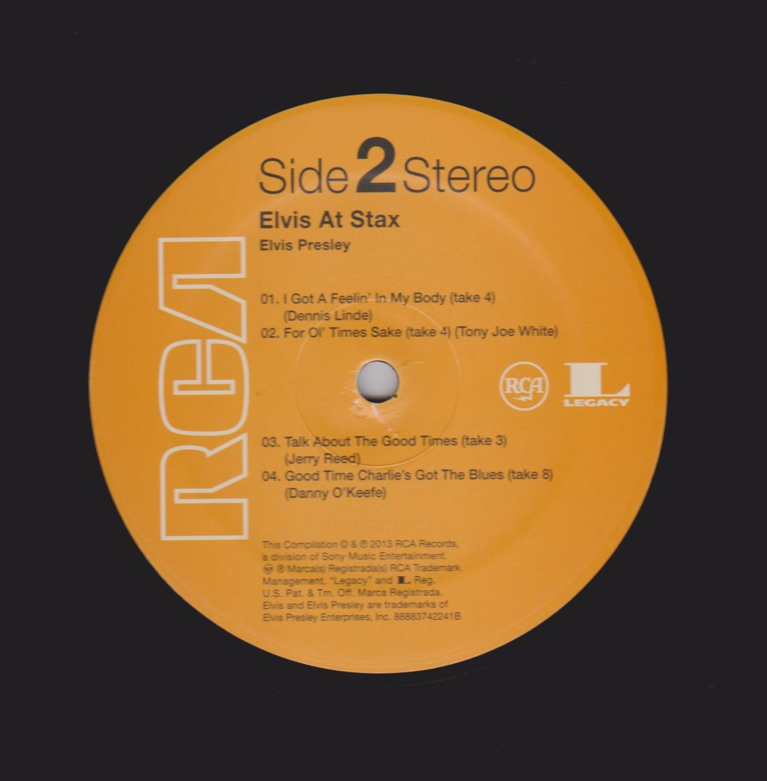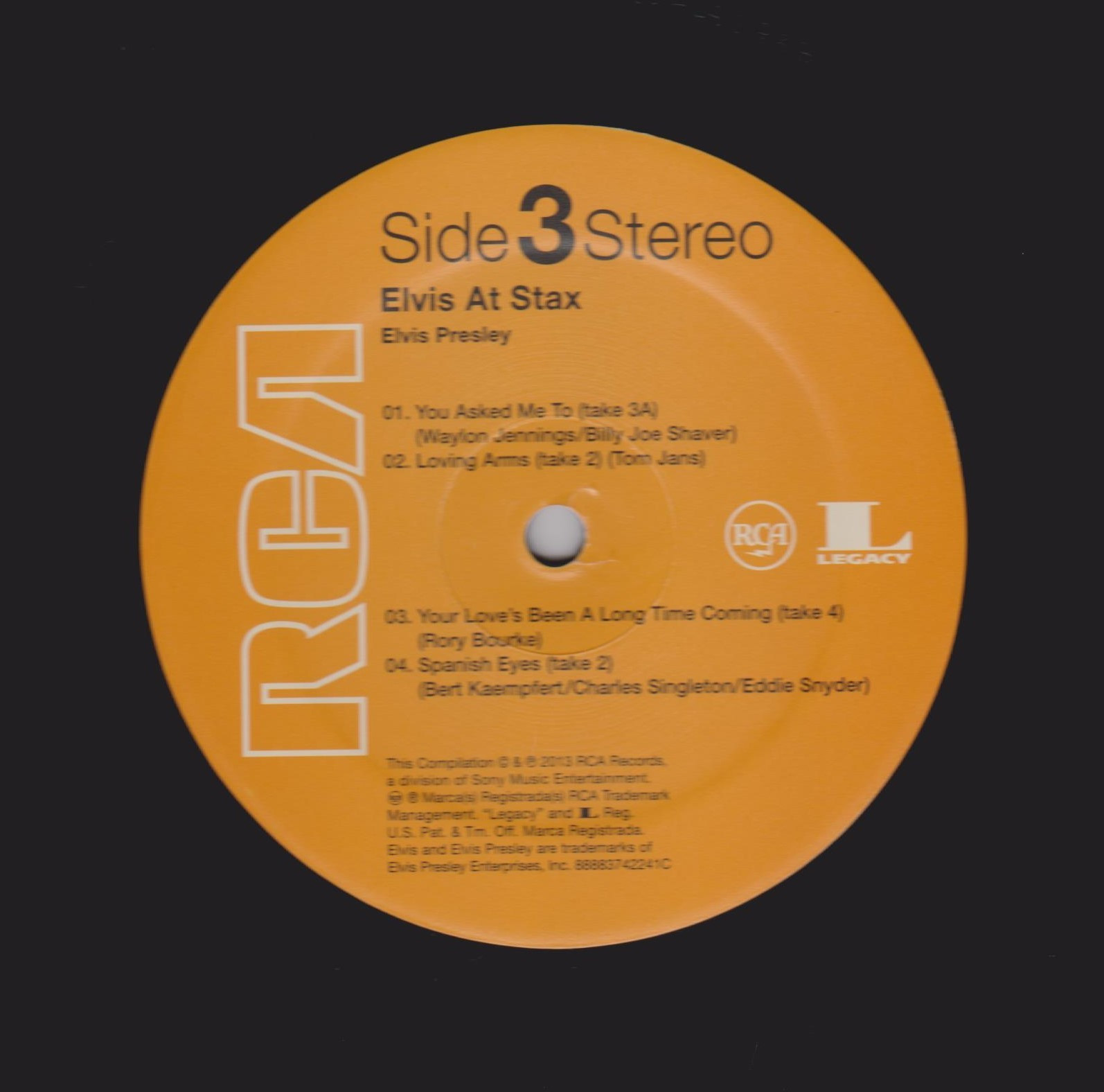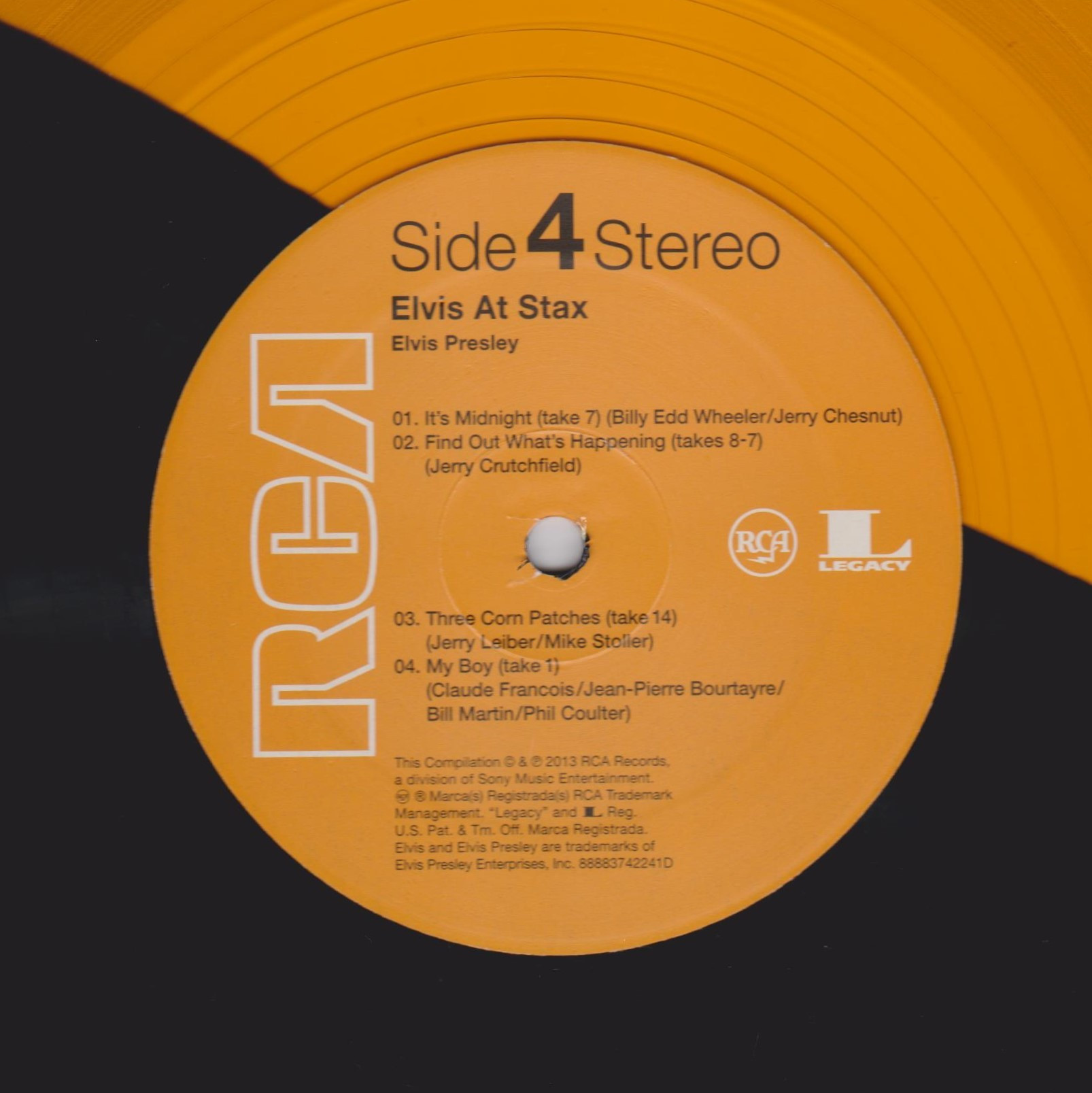 | Details : 2013 Reissue Front Cover : Photo of Elvis. Title to the left. Catalogue number on hype sticker. Rear Cover : Promoting 4 Elvis albums. Catalogue number bottom right. Label : Orange. Side 1 : Elvis At Stax Below Stereo. Side 2 : Elvis At Stax Below Stereo. Side 3 : Elvis At Stax Below Stereo. Side 4 : Elvis At Stax Below Stereo. Pressing Plant : United Record Pressing, Nashville Matrix Number Side 1 : 8888 - 3742241 - A KRGECA ? (Hand Etched) Matrix Number Side 2 : 8888 - 3742241 - B KRGECA ? (Hand Etched) Matrix Number Side 3 : 8888 - 3742241 - C KRGECA ? (Hand Etched) Matrix Number Side 4 : 8888 - 3742241 - D KRGECA ? (Hand Etched) *NOTE* 2 LP set. 2 Hype sticker. One states "40th Anniversary Of Elvis' Classic Recordings At Legendary Stax Studios". Second one states "Newbury Comics Exclusive". This release is on Half Black / Half Gold vinyl with a Limited number of 1000. This copy is No 00200. No insert with release. Came with a new bar code catalogue number on rear cover 8-88751-27861-5-3. |