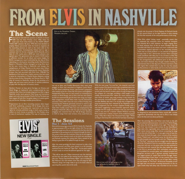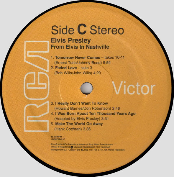 D : Phonographic Copyright ℗ – RCA Records Two LP distillation of the From Elvis In Nashville compact disc set. 50th anniversary of the 1970 "Marathon Sessions". Gatefold cover. Includes some previously released tracks newly mixed. Includes digital download coupon. Runouts are stamped except "A3",
